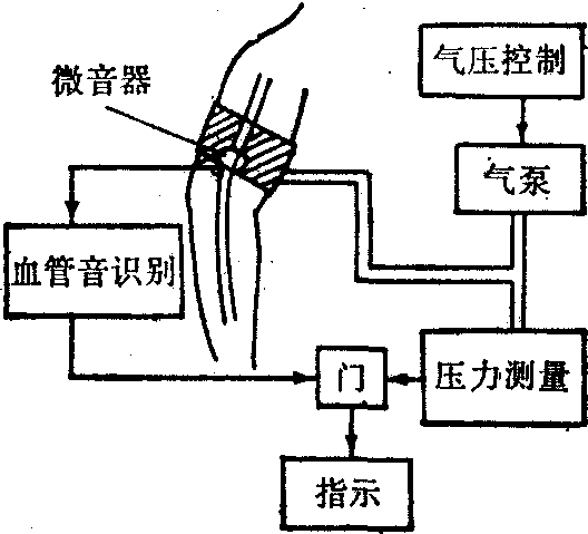 图1 典型的血压波形 血压是最常测量的生理参数。早在1728年,Hales Ste-phen(英)就采用将开口管子插入股动脉的方法,测量了非麻醉状态下马的血压。1861年,Chanven最早使用导管术测量了马的主动脉、左心室、右心室和右心房血压。1905年,Korotkoff(俄)首次报道了利用气袖式脉压计(Sphygmomanometer)间接测量人体收缩压和舒张压的方法,这是临床上至今仍最常用的标准的测量血压方法。二十世纪四十年代以来,随着电子技术的发展,一方面出现了多种自动血压计,广泛用于血压的无损伤检查;另一方面,导管式血压测量技术有了很大进步,并出现了导管尖端式血压计和可植入式血压计。 血压的测量方法分为直接式和间接式两大类。直接法能较精确地测量血压的动态变化波形,获得较多的血压数据,并能测量中心静脉压等低血压。该法对人体有损伤,主要用于心血管手术和重病人的监护及生理学实验等场合。间接法一般能断续测量动脉收缩压和舒张压,对人体无损伤,应用广泛。该法一般不能测量血压的动态变化及低的血压。间接法与直接法所测得的相应血压值相比,一般收缩压偏低,而舒张压偏高,差值在1,330Pa(10mmHg)以下;直接法的测量值更接近真实的血压值。 间接式血压测量 其测量系统置于体外,经皮肤和组织与血液耦合,间接测量血压。实用的测量系统有三个基本组成部分,即缠于肢体适当部位的气袖(Cuff)及其充气系统、动脉血液状态识别系统、血压测量及显示系统。气袖经组织耦合,对血管壁施加外压,其宽度以被缠部位肢体周长的百分之四十左右为宜,松紧应适中。充气系统为气袖充、放气。动脉血流状态识别系统用以确定气袖远心侧动脉血流的状态,进而控制血压数据的测量。当血流由阻断变为刚出现脉动流时,测量气袖内当时的气压,作为收缩压;当血流由断续脉动流形式变为连续脉动流形式时,测量气袖内的气压,作为舒张压。血压的测量及显示系统一般由测压装置和显示器组成,能给出收缩压、舒张压及平均压等血压数据。血压测量时,应保持气袖在与心脏相同的高度上。 间接式血压测量的传统方法是气袖式脉压计法,其测量系统由水银压力计或弹簧式气压表、充气袖袋(脉压袋)、听诊器及打气皮囊等部分组成。其中,压力计为血压的测量和指示装置;听诊器用以监听血管振动音(柯氏音),由此识别血流状态。这种方法广泛用作临床的常规血压检查方法,并常常作为校准其他血压计的标准,简便易行;其缺点是存在人为误差,不能连续测量,不能适合病人监护的要求。 间接式血压测量的自动方法是采用各种自动血压计。这种血压计能自动地定时测量血压数据,适用于临床监护和体格检查等场合,它按识别血液状态的方式不同,分为柯氏音式、脉波式、超声波式和相位差式等多种。 (1)柯氏音式自动血压计: 其基本工作原理如图2所示,由微音器检测血管振动音,自动识别柯式音,进而确定收缩压和舒张压。气压控制系统和气泵使气袖按一定速率自动充、放气。按需要和预置的程序,系统可自动定时工作,断续测定血压数据。这种血压计受环境噪音干扰较大,舒张压的测量精度较低。(2)脉波式自动血压计: 其特点是根据气囊远心侧动脉脉波的状态识别被测部位的血流状态。一种手指端脉波式自动血压计的工作原理如图3所示。当缠以气囊的指端脉波传感器无信号输出,而未加气囊的指端脉波传感器有信号输出时,表示气囊远心侧血流阻断,于是气囊自动减压;当二脉波传感器均有输出时,表示血流导通,于是气囊自动增压。这样,气囊内的气压便自动跟踪动脉收缩压。这种血压计能连续测量动脉收缩压,且因脉波传感器和气囊可置于指端等末梢部位,对病人扰动较小,较适合于长时间监测; 但不能测量舒张压,也不适合于脉波微弱的情况。