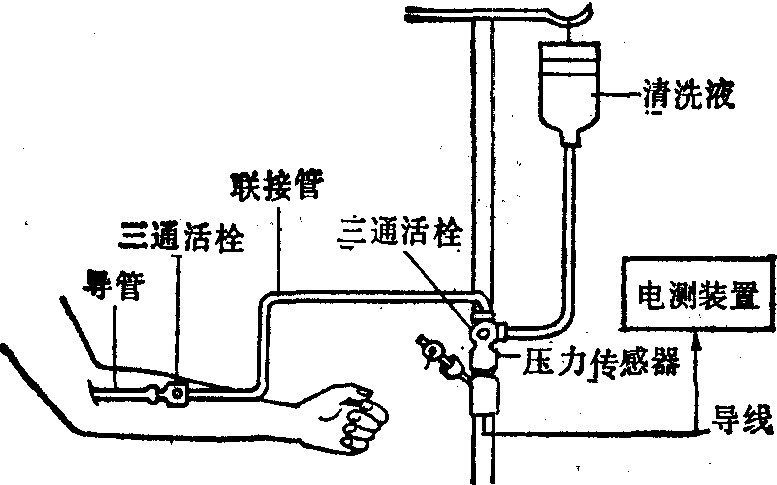 图3 指端脉波式自动血压计工作原理 (3) 超声波式自动血压计: 其特点是利用超声多普勒效应来识别血流状态。两只压电晶体超声换能器被置于缠在肢体上的气袖之下,与皮肤保持良好接触,一只发射超声波,另一只接收由血管壁反射的超声波。当血管壁运动时,被接收的超声波频率将发生相对于发射频率的微小变化 (即多普勒频移)。血管由阻断变为导通时,管壁振动快,频率变化大;血管由导通变为阻断时,管壁振动慢,频率变化小。这种频率变化经检波和音频放大后,能变为音频信号或可听的声音,即多普勒频移信号。按多普勒频移信号可识别血流状态,从而确定收缩压和舒张压。随着气袖自高气压放气,第一次出现多普勒频移信号时,气袖内压作为收缩压; 此后,每个心动周期将先后出现高、低频频移信号各一次,当低频频移信号向高频频移信号靠近并重合时,气袖内压作为舒张压。这种血压计能防止环境噪音干扰,可用于血流微弱的病人及婴幼儿的血压测量,但易受身体活动的影响。 (4)相位差式自动血压计: 其特点是根据从分置于血流远、近心侧二气袖下脉波传感器输出信号间出现相位差识别血流状态;在血流完全导通时,相位差消失。随着两个气路相连的气袖被放气,当二脉波传感器由无信号变为有信号输出,并出现相位差信号时,气袖内压作为收缩压; 当二脉波传感器的输出信号间的相位差由存在转为消失时,气袖内压作为舒张压。这种血压计能避免环境噪音的干扰,但设备较复杂,应用较少。 上述各种血压计在临床应用时,应保证充、放气系统的控制可靠,并具有气压保险装置,使系统在气袖压力超过3.99×104Pa(300mmHg)时能自动停止加压,同时使气袖自动放气。 近年来,间接式测量血压动态变化波形的方法正处于研究中,其主要目的在于克服现有方法的不连续性,以便在对人体无创伤条件下获取更多的血压数据,并力求排除因断续阻断血流和缠绕袖带对病人的有害影响。这类方法中,张力测定法和容积补偿法的研究较多。 ❶张力测定法:其基本原理是,传感器固定于被测部位体表外,待测的浅表动脉血管被传感器压扁,传感器取压头的感压平面处于血管扁平区内,此时皮肤张力无垂直分量,传感器只检测动脉血管内压,于是能测量血压及其动态变化。这种传感器的定位方法有待进一步解决; ❷容积补偿法:其基本原理是通过伺服压力系统调节血管外部压力与其内部压力平衡,从而保持血管容积不变,而伺服压力系统又由被测部血管容积信号控制,于是外压系统的压力能跟随血管内压变化,通过检测外压系统的压力,即可获得血压的幅度和波形。将伺服压力系统和容积脉波传感器装于手指上,可测量手指动脉压。这种方法已趋实用,其缺点是检测系统较复杂,重复性较差。 直接式血压测量 其测量系统与血液直接耦合。实用的测量系统,一般由导管系统、血压传感器和电测装置等三部分组成。导管在X线透视的监视下,经外周静脉或动脉导入至心脏或大血管内的欲测部位; 血压传感器将血压信号转变为电信号;电测装置放大信号,并测量和显示血压波形及其血压数据。按血压传感器与血液耦合方式的不同,上述导管式血压计分为充液导管式血压计和导管尖端式血压计。 (1)充液导管式血压计: 其特点是血压传感器置于体外,由导管内充满的液体传递血压,如图4所示。测量系统中,导管尖端开口,管内充以肝素氯化钠溶液,用以将