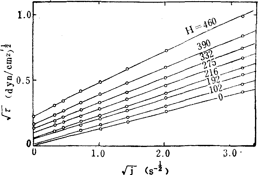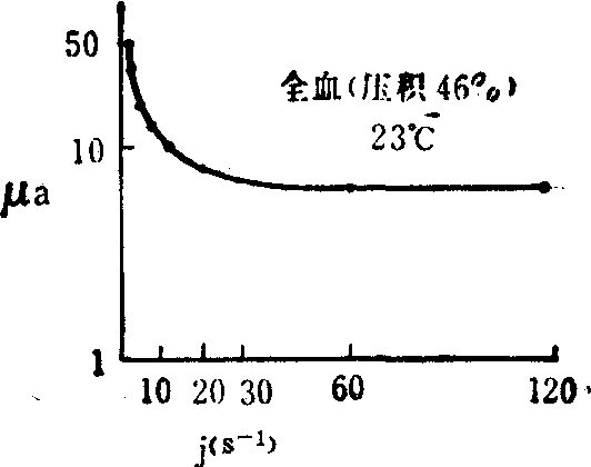 图3 红细胞聚集和变形对血液粘度的影响 会聚集。实验结果表明,这种悬浮液的粘度低于正常血液。NP和NA的差异说明红细胞聚集对血液粘度的影响。 (5) 血液的本构方程:实测表明,血液的本构方程可以在切变率的很大范围内 (1-105S-1) 用Casson方程描 ![]() 称为Casson粘度, fc 称为Casson屈服值。血液的粘度和屈服应力主要依赖于温度和红细胞压积。图4表示温度对血液粘度的影响。在同样的切应变率j及压积H下,温度升高将导致粘度降低。研究压积对μ0及fc的影响,对于了解病理条件下血液粘度的变化十分必要。图5表示在不同压积下,血液的Casson曲线,由此可看出H对μc及fc的影响。