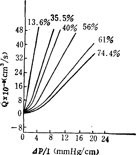 图5 不同压积下的血液Casson曲线 血液的流动曲线 血液在圆管内流 动时,压差△p与 流量Q的依赖关 系,称为血液的流 动曲线。牛顿流体 的流动曲线呈线性 关系。血液是满足 Casson方程的非牛 顿流体,其流动曲 线是非线性的,而 且随细胞压积的改 变取不同的形态 (图6)。图6表明: ❶压积很小时(例如13.6%),血液的流动曲线基本上是一条通过原点的直线,血液呈牛顿特