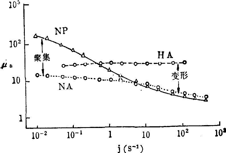 压积为46%的全血 测出的血液表观粘 度μa和切应变率 j的关系,表明其 表观粘度不是常 数,而是随j的增 加而减少,呈现出 剪切稀释的性质。 切应力τ和切应变 图1 血液表观粘度与切应变率的关系率j的关系不是直 线,而是一条曲线, 如图2所示。在高 切应变率时,粘度 趋于常数,血液可 近似地看作是牛顿 流体; 但在低切变 率,表观粘度急剧 增长,非牛顿效应 十分显著,此时必须将血液看成是非牛顿流体。 ![]() 图2 血液切应力与切应变率的关系 (3) 血液的屈服应力:当血液的应变率趋于零时,切应力不趋于零而是趋于有限值,该值称为屈服应力 (Yieldstress)。血液屈服应力的存在,意味着当切应力小于某一值时,血液不发生流动; 只有当所受应力高于此值时,才会发生流动。 (4) 红细胞聚集作用: 血液呈现非牛顿特性是由红细胞引起的。早在1929年,Fahraeus发现人血的红细胞会聚集形成缗线状结构,切应变率越低,聚集作用越强; 当切应变率趋于零时,人血变成一个大的凝聚体,其形态类似于固体,切应力必须超过屈服值才能使其流动。由此可见,红细胞聚集是血液呈现屈服应力的原因。血浆蛋白能使红细胞凝聚能力提高,而纤维蛋白原是影响红细胞聚集的主要蛋白质。纤维蛋白原显示了比正常血浆高19倍的特殊聚集能力。仅占血浆蛋白5%的纤维蛋白质使血液的屈服值提高一半。其余的蛋白质和红细胞的贡献各占一半。根据Merill等人的研究,屈服应力f和纤 维蛋白原浓度的关系为 ![]() 是红细胞压积,B是与纤维蛋白原的浓度有关的常数。当切应力由屈服值起不断增大时,聚集体逐渐裂解,变得越来越小,导致血液粘度减小; 当切应力进一步增大时,红细胞变形越来越显著,红细胞被拉长,并取顺着流线的方向,促使血液粘度进一步减小。当切应力增加到一定值后,所有聚集体已分散成单个细胞,此时再增加切应力,将不再引起粘度的改变,表观粘度趋于常数,τ-j的关系趋于牛顿流体的直线关系。图3清楚地说明红细胞聚集和变形对血液粘度的作用。NP表示正常血液,NA表示正常红细胞在白蛋白-Ringer溶液中的悬浮液,这种溶液不含纤维蛋白原和球蛋白,因而红细胞不