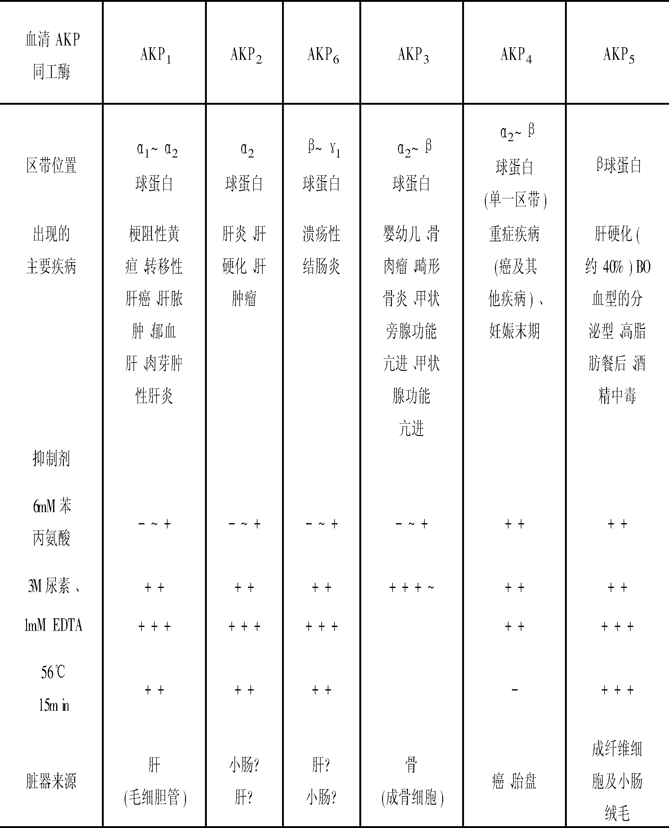 血清碱性磷酸酶(AKP)经琼脂电泳可分出6种同工酶,从阳极侧按顺序命名为AKP1~6,AKP1来自肝脏,电泳上位于α1~α2球蛋白位置;AKP2在电泳上位于α2球蛋白位置,其来源不太清楚;AKP3来源于骨,电泳在α~β球蛋白之间,乳幼儿血清中的AKP几乎全是AKP3;AKP4由胎盘和癌组织而来,电泳也在α~β位置,但靠近β侧,是单一区带;AKP5来源于小肠及肝的成纤维细胞,电泳在β球蛋白位置;AKP6在溃疡性结肠炎时出现,电泳在β~γ1位置。为了测定血清中某一特定的AKP同工酶的活力,可加入特异性抑制剂将其他同工酶进行抑制,即可排除其对测定的干扰,例如L-苯丙氨酸可抑制肠和胎盘AKP;加入尿素对骨AKP抑制程度要大于对肝AKP。其临床意义见下表: