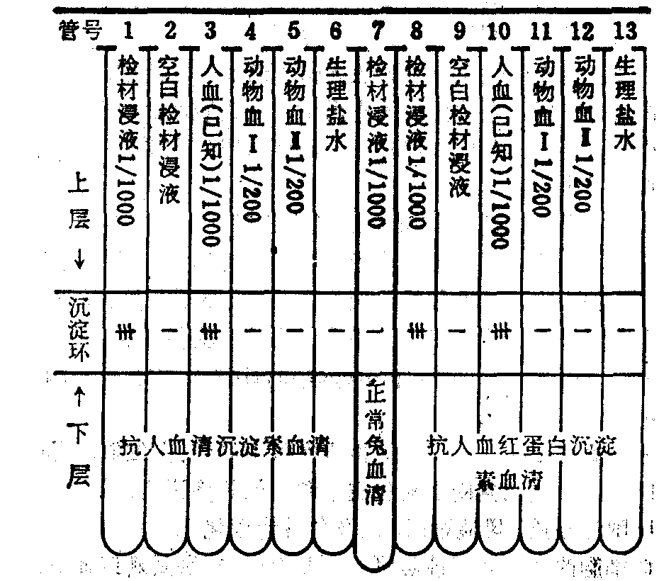 | 释义 | 血痕种属判定 血痕种属判定斑痕确定为血痕后,尚须判定该血痕是人血还是动物血,必要时还须判定是何种动物血,即为血痕种属判定。经典的方法是血清沉淀反应。即将某一种属的动物蛋白(抗原)注射于另一种动物体内,该动物血清中便产生对该抗原起特异反应的物质(抗体——沉淀素)。取该免疫血清与所注射抗原同一种属的蛋白溶液在试管内混合时,便产生白色沉淀,是谓血清沉淀反应。此外,目前还应用抗人球蛋白消耗试验、被动红细胞凝集反应、胶乳凝集反应、血红蛋白碱变性等免疫学反应及生物化学检验法判断血痕种属来源。 环状沉淀反应(以鉴别人血痕为例)