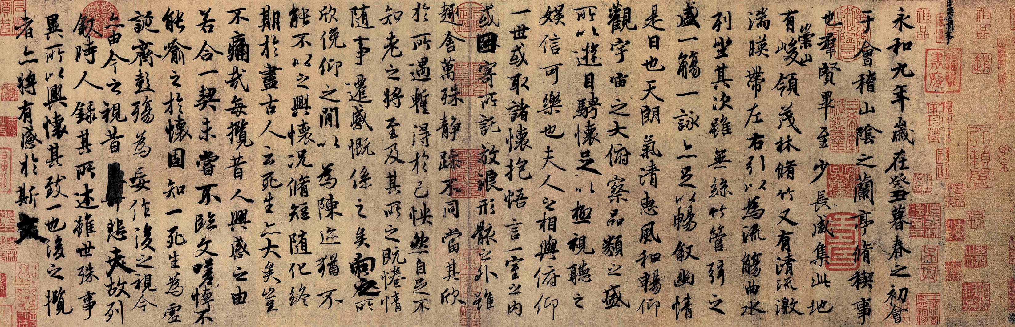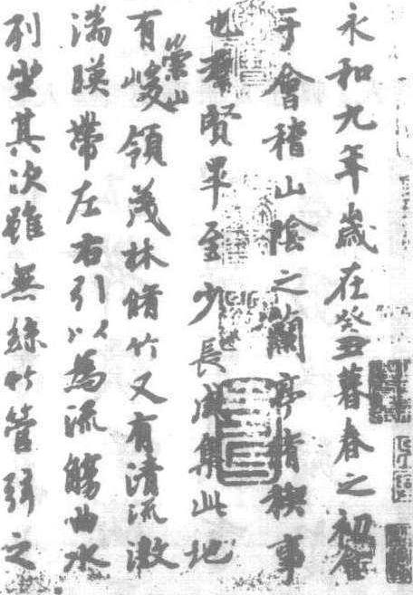 《兰亭序》是晋代书法大师王羲之于东晋穆帝永和九年(公元353年)为一次诗人聚会上所作诗集书写的序文手稿。全文共28行,324字。因其章法结构、笔势字态完美绝伦,被历代书法家誉为“天下第一行书”。相传唐太宗对王羲之书法推崇备至,将此稿的原迹作为殉葬永绝于世。今之所传摹本以“神龙本”和“定武本”最为接近原本。 |