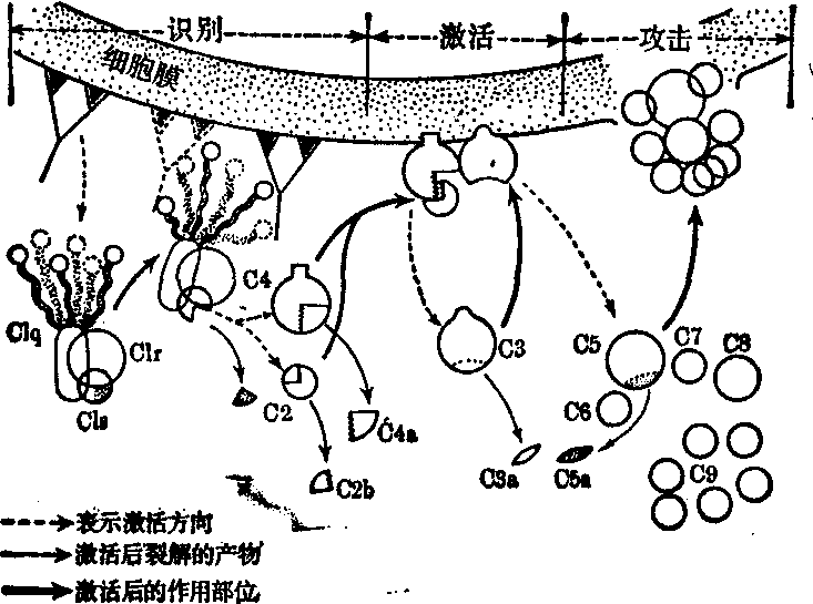 *不同作者,报告不一致。 补体各成分除C1q以外,在体内常以酶的前体形式存在。最初只知道抗原抗体复合物能激活补体,单独抗原或抗体不能激活补体。以后又发现,补体还可通过另一途径被多糖或凝聚的免疫球蛋白激活。前一种称为传统(激活)途径,后一种称为替代(激活)途径。 参与传统 (激活) 途径的11种补体蛋白分子,在其活化过程中,可分为三种功能单位: 识别单位,由C1q、C1r、C1s组成; 活化单位,由C2、C3、C4组成;膜攻击单位,由C5、C6、C7、C8和C9组成。同一功能单位的补体分子彼此有化学亲和性,激活后可相互结合在一起,共同执行一种生物学功能。其具体激活步骤简述如下。C1是由C1q、C1r及C1s三种成分依赖钙离子键结合成复合物的形式在血清中存在的。当抗原 (如绵羊红细胞)与抗体(IgM、IgG1、IgG2或IgG3)结合时,首先由C1q的六个羧基末端的类似六朵郁金花样的分子与抗体Fc分段结合,结合后发生构形改变使C1r活化,被激活的Ir (已被激活的补体成分用C 表示)再激活C1s,于是三者结合构成激活的CI,使C1从酯酶原变成酯酶。 然后CIs裂解C4为大分子的C4b和小分子的C4a; 同时裂解C2为大分子的C2a和小分子的C2b。C4b按抗体所指定的方位结合到细胞膜上,C2a再结合到C4b上, 构成C 。 C 是C3转化酶, 可激活C3,使C3裂解成大分子的C3b和小分子的C3a。C3b可与C 结合,并结合到细胞膜上或非特异地单独结合到细胞膜的另一部位上。 C 与C 的复合物C b 即为C5转化酶,裂解C5为大分子的C5b与小分子的C5a。C5b再与一个分子的C6和C7结合, 构成C5 三聚合物。此复合物通过C5b再结合到细胞膜的另一部位上。 C 又为C8提供了结合点,使C8结合到C 上。 此即开始诱导出细胞膜的轻度损伤。 C 又可与6个C9分子结合,而成为分子量超过1,000,000的复合体,促使细胞溶解。但细胞裂解是否确需C9参加,尚不十分了解。这一溶解细胞的机制,对于破坏外来的细胞,包括细菌和移植组织在内,可能是重要的。这一机制在自身免疫病中也可能很重要,可使宿主的自身组织遭到免疫性攻击。在传统激活途径中,补体各成分裂解而游离出的小分子片段,在免疫反应中也有重要的作用,如C3a和C5a有过敏毒素的作用,能引起肥大细胞和嗜碱粒细胞的脱颗粒作用,释放出细胞内所贮存的有生物学活性的胺类; C5a比C3a及 对中性粒细胞有更强的趋化性,在协调对抗原的免疫应答和非特异性炎症应答中有重要意义。