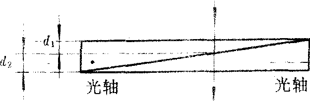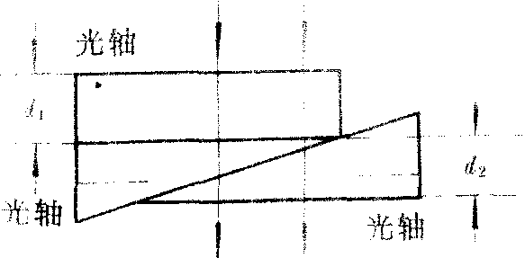 图1 索累补偿器(见图2)可用于宽阔的入射光束。上面是一块平行平面石英板,下面为两块相同的楔形石英棱镜。平板和棱镜中的光轴方向都与表面平行,但互相垂直。光束垂直于表面入射,在两个棱镜重叠的区域内,上面石英板的厚度处处相同,下面两个棱镜的总厚度d2也是相同的,各处产生的位相差δ均相同。只要沿着斜面移动下面一个楔形棱镜,就可改变d2,从而得到连续可变的位相差。光在索累补偿器中是垂直通过的。