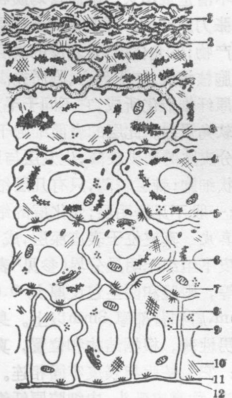 叶片表皮的气孔器最多。背腹型叶、下表皮的气孔器多于上表皮; 等面型叶的上下表皮气孔器数目相近; 漂浮水面的叶片,气孔器仅限于上表皮; 沉水植物叶片没有气孔器。单位面积气孔器数,阳生植物比阴生植物多,木本植物比草本植物多。具网状脉叶片的气孔器呈不规则星散排列,而平行脉的气孔器呈纵行排列。 保卫细胞通常呈肾形,细胞壁厚薄不均,近气孔的一侧较厚,邻接表皮一侧较薄,细胞壁纤维素的微纤丝呈辐射状排列。随着体内生理状况的变化,保卫细胞中糖分增加,吸水膨胀,壁厚处扩张较少,壁薄处扩张较多,因而2个保卫细胞相对弯曲,致使气孔开启。当保卫细胞失水降压时,扩张处缩还原状,气孔关闭。禾本科植物的保卫细胞呈哑铃形,两端壁较薄,中部壁较厚。当吸水时,壁薄的两端膨大,以致中部相互分离,气孔启开; 失水时,两端萎软,气孔关闭。 表皮附属物 有些植物的表皮上有毛状体附属物,由表皮细胞突起形成,为单细胞或多个细胞构成,如腺毛、腺鳞(见分泌结构)、乳头状突起、表皮毛、星状毛等。一般认为毛状体有对增强表皮的保护作用。 表皮epidermis❶动物被皮(皮肤)的最外层上皮。陆生脊椎动物由复层扁平上皮构成。哺乳类的有毛表皮由里向外包括基层、棘细胞层、颗粒层和角质层。而无毛或厚皮肤的颗粒层与角质层间还有透明层。表皮主要由角质形成细胞组成,此外还有黑色素细胞、郎格罕细胞和麦克尔细胞。基层亦称生发层,细胞位于基膜上,分裂增生能力最强,不断将增殖的细胞向浅层依次推移,补偿表面角质层细胞脱落的损失,维持表皮厚度相对恒定,基膜连接真皮。表皮内无血管,营养物质等经过通透性很强的基膜由真皮入表皮。有保护、防御、感觉及防止汗液丧失等功能。