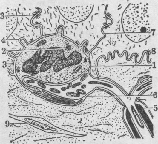 图4 Merkel细胞超微结构模式图 1.Merkel细胞 2.高尔基复合体 3.桥粒 4.细胞突起 5.有髓神经纤维 6.触盘 7.基底层细胞 8.半桥粒 9.成纤维细胞 电镜下见它们与相邻细胞藉半桥粒相连,桥粒附近有少量张力丝。胞质含较多的线粒体、游离核糖体和溶酶体。细胞的明显特点是基部胞质含许多圆形电子致密颗粒,直径80~100nm,有界膜包裹,内有致密核心,与肾上腺髓质细胞内的颗粒相似(图4)。此细胞的来源不明。因它象表皮上皮细胞,故有人推测它们由上皮细胞演变,但也有人认为它们来源于神经外胚层,随同神经纤维进入表皮。此细胞与附着的神经末梢共同构成触盘(参见“神经末梢”条)。生理学研究表明,触盘是一种慢适应的触觉感受器,但细胞在感受刺激中的确实作用尚不了解。有些学者根据细胞所含颗粒的特点,将它们列入APUD细胞系(参见“APUD细胞系统”条)。 ☚ 皮肤 毛 ☛ 表皮epidemis |