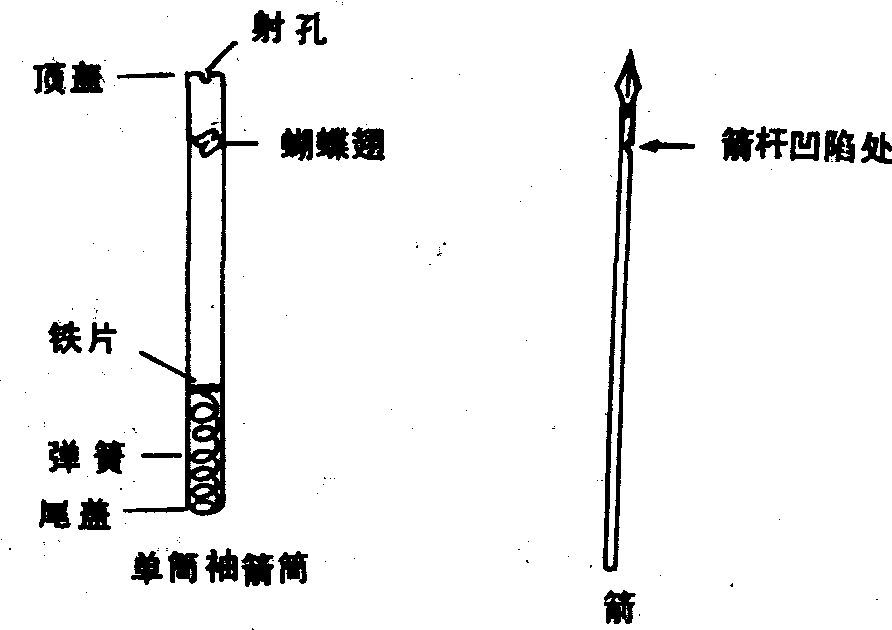 | 释义 | 袖箭 袖箭暗器的一种。以此器可藏于袖中应用故名。《元史·顺帝纪二》:“辛未,禁弹弓、弩箭、袖箭”。茅元仪《武备志》卷一百二:“袖箭者,箭短而簇重,可以御人三十步之远”。袖箭分为单筒袖箭、双筒袖箭、三才袖箭(三个箭筒相连)、四象袖箭(四个箭简相连)、梅花袖箭(六个箭简相连)等数种。“袖箭”包括箭筒和箭。箭筒为直径8分、长8寸的金属圆简。筒顶盖上有射孔,距盖1寸处装有“蝴蝶翅”。筒内装一弹簧,其下端连于尾盖、上端连一圆铁片。箭为竹杆、铁头。杆长7寸,头长1寸。使用前,将箭装入筒内,弹簧被压紧,蝴蝶翅将箭杆凹陷处卡住。发射时,拨动蝴蝶翅,箭即被弹簧弹出。