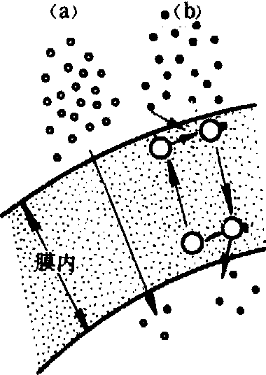 自由扩散 又称单纯性经膜扩散。气体分子、水、尿素、甘油和一些脂溶性物质顺浓度梯度直接通过脂质双层,很少耗能,不需载体。一般脂溶性小分子物质均以自由扩散方式通过膜,扩散速度与其在脂肪中的溶解度成正比,并与其极性和膜两侧溶质的浓度差有关。一般脂溶性较强的分子,极性较弱,容易经膜自由扩散。反之,脂溶性差而水溶性较强的分子,因其极性强而难以经膜扩散。甘油分子例外,它虽有一定极性,但因其两个分子可以缔合成二聚体,使极性降低,能较快通过膜。非脂溶性小分子的通透性,与其分子大小和所带电荷有关,分子越小,透过能力越强。水分子具极性,几乎不溶于脂质,但能迅速通过细胞膜,一则由于其不带电荷,二则推测在膜上有0.8~1nm宽的小孔,膜蛋白的亲水残基构成了小孔的内表面。但其他水溶性的物质很难通过。各种细胞膜上小孔孔径的大小不同,可受激素等因子调节,如抗利尿激素能使膜孔由0.6nm增至2nm,从而水和尿素能通过肾小管细胞膜被吸收。 协助扩散 某些代谢所需的非脂溶性物质如糖、氨基酸、金属离子等,借助镶嵌于质膜上的离子载体或离子通道顺浓度差而进行的物质转运。亦称促进扩散或易化扩散。协助扩散的机理,至今尚不甚了解。根据对人工膜的实验结果,提出脂溶性泳动载体和穿膜孔道两种机制(图2),推测天然质膜也存在类似机理。离子载体为膜上的小分子,依靠其与被运输物质特异的亲和力和本身的构象变化,将非脂溶性小分子物质顺浓度差经膜转运有高度的选择性,如缬氨霉素对K+的运输过程。K+是以水合离子的形式存在,不易通过磷脂双分子层的人工膜。缬氨霉素是具环状结构的脂溶性抗菌素,由6个氨基酸和6个有机酸组成,其环状结构内部所含亲水空间仅能容纳水合K+,在其协助下,K+可顺浓度差透过膜,但Na+不能通过。又如葡萄糖分子顺浓度差进入红细胞,是靠红细胞膜上的一种四聚体蛋白质而实现的。四聚体与葡萄糖分子具有特异的亲和力,当葡萄糖与这一膜蛋白外侧亚单位结合时,膜蛋白发生构象变化,将葡萄糖移向膜的中部,而后内侧亚单位又发生构象变化,将葡萄糖分子转入细胞内。