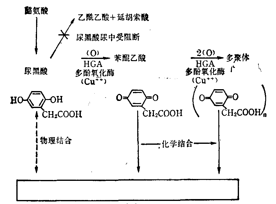 本病系尿黑酸尿症患者晚年的一种并发症。尿黑酸尿症系由于苯丙氨酸降解过程中,尿黑酸氧化酶缺陷所致。患者排出的尿,接触空气,逐渐变黑。本病罕见,系常染色体隐性遗传。其发病机理如下: