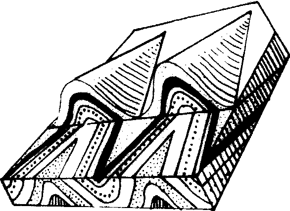 图1 褶曲要素 AB、CD. 翼; 被ABGCD包围的内部岩层. 核;BGC. 转折端; GE. 枢纽; HIEF. 轴面; FE. 轴 褶曲有两种基本形式,即背斜和向斜。向上凸出的褶曲,岩层自轴面向两侧倾斜,或者更确切地说,褶曲的核部为老岩层,两翼为新岩层的褶曲称为背斜;向下凹的褶曲,岩层自两侧向轴面倾斜,或者更确切地说,核部为新岩层,两翼为老岩层的褶曲称为向斜。由于褶曲的形态是多种多样的,例如图2中D、E所表现的形态,只凭上凸、下凹是无法断定哪是背斜和向斜,因此只有根据核部和两翼的新老关系,才能区别开来,所以,在上述背斜和向斜的概念中的后一半表述才是最正确的。按褶曲形态可以分成许多类,从褶曲横剖面形态看,根据轴面产状可以分为直立、倾斜、倒转、平卧和翻卷等5种褶曲(如图2)。根据转折端形状及两翼特点可以分为: 箱形褶曲 (图3)、锯齿状褶曲(图4)、等斜褶曲 (图5)、扇形褶曲 (图6) 等。