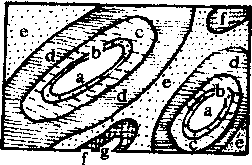 图10 短背斜和短向斜,穹窿和构造盆地 (左为短背斜; 右为穹窿构造; 中下为短向斜。中上为构造盆地) a—g岩层从老到新