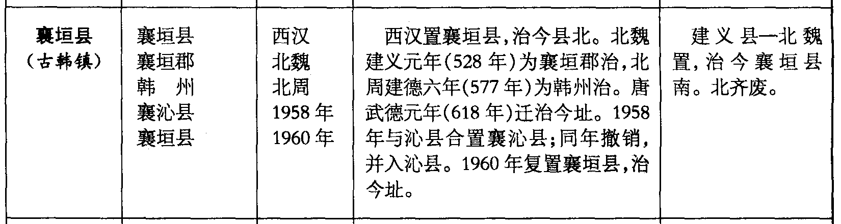 襄垣县(古韩镇)襄垣县襄垣郡韩州襄沁县襄垣县西汉北魏北周1958年1960年西汉置襄垣县,治今县北。北魏建义元年(528年)为襄垣郡治,北周建德六年(577年)为韩州治。唐武德元年(618年)迁治今址。1958年与沁县合置襄沁县;同年撤销,并入沁县。1960年复置襄垣县,治今址。建义县—北魏置,治今襄垣县南。北齐废。