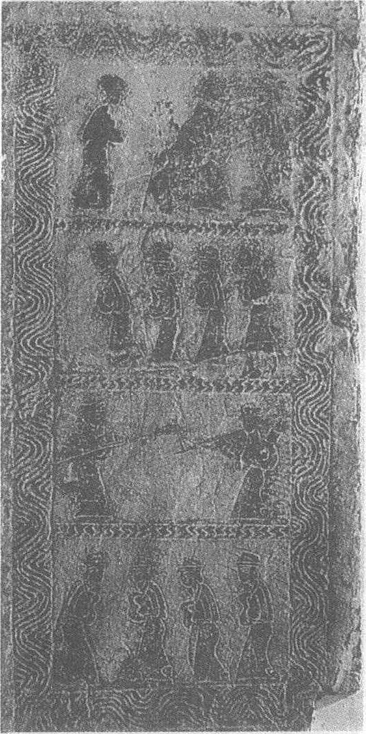 | 释义 | 观武画像石 观武画像石东汉。长123厘米,宽59厘米。江苏省铜山韩楼出土,江苏省徐州博物馆藏。由阴线法刻成。在多重起伏连绵的波浪纹边缘内,三条波折纹将石面分成相等的四格。第一格内右边刻一人,左向躬身揖首,向对面的三个人作邀请状。第二格内四人排成一行,袖手前行。第三格内刻二人格斗比武。第四格内,右边左向的人,作揖首状,向对面的三个人话别。此画像石以格斗比武为中心分为四段:邀请、前行、比武、送行,内容连贯,上下前后呼应,宛如连环画,令人一目了然。