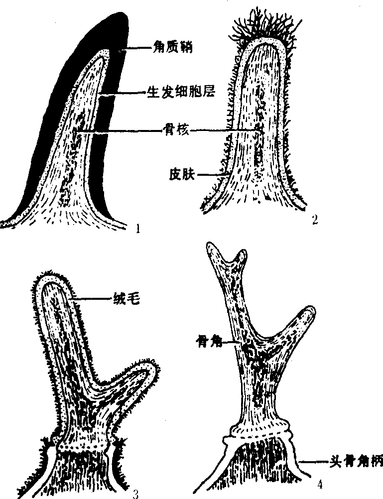 图241 洞角和实角 1. 洞角 2. 长颈鹿角 3. 鹿茸角 4. 鹿角