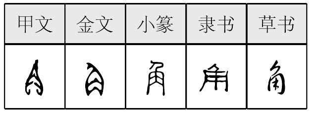 象形,甲骨文、金文、小篆象兽角之形,隶定为“角”。本义读jiǎo,兽角,引申为样子像角的事物、物体两个边的会合处、角落等;又读jué,引申为竞赛、争胜、角色、演员等。 【辨析】 ❶以“角”作意符构成的字有的与兽角有关,如“觥”为兽角做的酒器,“解”为用刀分割牛角或牛体,“触(觸)”为用牛角相抵触。 ❷以“角”作音符构成的形声字一般韵母为ue,但声调和声母不同。jué:桷、觖∣què:确。 ❸“鬓角、独角戏、角门、角色”也作“鬓脚、独脚戏、脚门、脚色”,现在的推荐写法是前者。 ❹在台湾,“角”的下部中间竖画底下不出头。 ❺角/较 见192页“较”。角 (jiǎo)上象其尖,下象其體,中象其理。 角 甲 金 篆 隶jiǎo【析形】象形字。甲骨文、金文字形像兽角之形。小篆字形有所讹变,隶、楷字形从之。 【释义】《说文》:“兽角也。”本义是兽角,引申为形状像兽角的东西,后又引申为角落。古人对兽角的利用非常广泛,其中一种用处是做酒杯,这个意义读jué。最初为天然骨角,后仿角形造出陶角、玉角、青铜角。形制与爵相似,前后两尾沿口端斜出似角,有盖,但无流、无柱。《礼记·礼器》:“宗庙之祭……尊者举觯,卑者举角。”角是饮酒器,一些从角之字如觚、觯、觥、觞等,皆是酒器。 【shape analysis】It is the pictograph character.In Oracle and Bronze Inscriptions,it looks like animal horns. 【original meaning】The horns. 角 ☚ 谷 局 ☛ 00000777 |