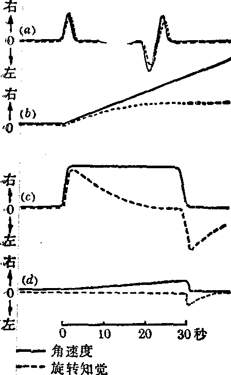 | 释义 | 角加速度 角加速度jiaojiasudu见“刚体定轴转动”。 ☚ 角速度 质心运动定理 ☛ 角加速度描述角位移变化快慢和方向的物理量。角速度的变化和所历时间的比值称为这段时间内的平均角加速度。当所历时间趋于零时,这一比值称为物体在该时刻的瞬时角加速度。角加速度可用矢量表示,其方向就是角速度变化的方向。它的SI单位是弧度/秒2。 角加速度 角加速度当飞机作横滚、螺旋、盘旋动作,以及飞机转弯或遇气流发生各种摆动时,均有角加速度影响发生。半规管系统是感受角加速度适宜刺激的器官,对保持空间定向、维持身体姿势平衡颇为重要。但在一定条件下,角加速度刺激也可引起飞行错觉、晕机病等而影响飞行工作和安全。深入研究角加速度的生理效应,对于空勤人员医学鉴定、飞行错觉的预防和克服、飞行训练以及飞行器的设计等均具有重要意义。 △P=2ξρS。 通常ρ、S是常量,故△P即决定于ξ值。半规管系统对头部倾动产生正确反应的理想条件是: 头部转动频率范围0.5~5.0Hz; 角加速度作用时间在2s以内。此种条件下,内淋巴液流动的角度与胶顶偏移角度一致。主要是处于旋转平面上的半规管的内淋巴液发生流动,产生最有效的刺激,但其他半规管的内淋巴液也发生流动,产生相应的刺激。引起前庭生理反应的角加速度阈值,文献报道不尽一致,与各作者实验条件不同有关。不同轴向角加速度的生理阈值范围为0.035~8.2°/s29,公认的平均值为0.5°/s2。角加速度所引起的生理效应与其值和作用时间有关。在一定范围内,两者呈指数关系,角加速度值越高所需作用时间越短。对角加速度易感者,很低的角加速度值和很短的作用时间即可引起明显的生理反应。角加速度所引起的前庭生理反应有: 前庭知觉反应、前庭小脑反应、前庭植物神经反应、前庭眼动反应和前庭脊髓反应等。 前庭知觉反应 角速度不引起半规管内淋巴液流动,故亦不引起旋转知觉。匀角加速度使内淋巴液作惯性移动,乃引起旋转知觉。角加速度的变化可使内淋巴液作加速或减速惯性移动,引起加速或减速旋转知觉。绕立轴 (Z) 的角加速度引起与旋转方向一致的水平旋转知觉,该轴向的角减速度引起与旋转方向相反的水平旋转知觉。绕纵轴(X)的角加速度引起与旋转方向一致的滚转知觉,该轴向的角减速度引起与旋转方向相反的滚转知觉。绕横轴(Y)的角加速度引起与旋转方向一致的翻转知觉,该轴向的角减速度引起与旋转方向相反的翻转知觉。除方向性外,角加速度的其他参数,如持续时间、加速度的时间变化率等不同时,所引起的旋转知觉也不一样。以绕立轴 (Z)的水平旋转为例 (见图),只是当阈上角加速度刺激的作用时间在2秒以内 (图中a),或在角加速度刺激持续作用的初始阶段 (图中b、c)才有正确反映实际的旋转知觉; 其他情况下都引起错误知觉。两个或三个轴向的角加速度刺激同时作用于半规管系统将引起更复杂的知觉反应(见“科里奥利加速度”)。 三个轴向旋转的前庭眼动反应