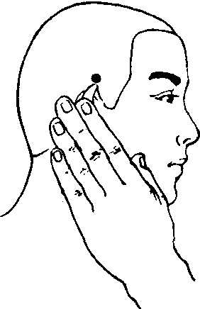 图81 角孙jiǎosūn经穴名。代号SJ20。出《灵枢·寒热病》。属手少阳三焦经。位于耳尖上方之发际处,折曲耳廓取穴。主治目翳、急性结膜炎、腮腺炎、偏头痛、项强。沿皮刺0. 3 ~0. 5 寸。