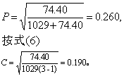 式中A为R×C表中每格的实际频数或对子数,nR与nC分别为实际频数所在行R、列C的合计,n为样本含量或总对子数,R为行数,C为列数。条目“样本构成比的比较”中,计算x2的其他公式亦可选用。算得x2值后,查x2界值表得P值,按所取检验水准作出推断结论。 经x2检验推断两因素间有相关关系,若须进一步说明相关的密切程度,可在计算x2值的基础上,按式(5)或式(6)计算列联系数。其值在0~1之间,0表示完全独立,1表示完全相关,愈近于0,说明几乎没有关系,愈近于1,说明关系愈密切。列联系数有多种,常用的如下: (1) Pearson列联系数(P)
