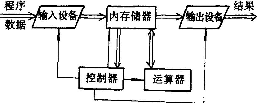 前大多数计算机来讲,硬件是由控制器、运算器、存储器、输入设备与输出设备五个主要部分组成,它们之间的关系如上图所示,图中的粗线(双线)表示数据传输通道,单线表示控制线。具有这种体系结构的计算机叫做冯·诺依曼计算机。