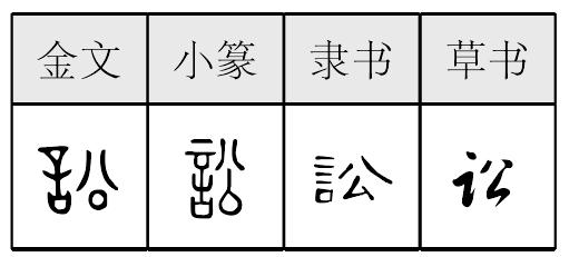 西周以来的形声字。从讠(言),公声。声母演变如公松颂例。公也兼意。本争论,争辩义,即争论要有公道。如:聚讼。在《说文》所载战国文字从谷声,韵变阳入对转。后用于在法庭争辩,打官司。如:讼事|成讼。组词如:诉讼。
