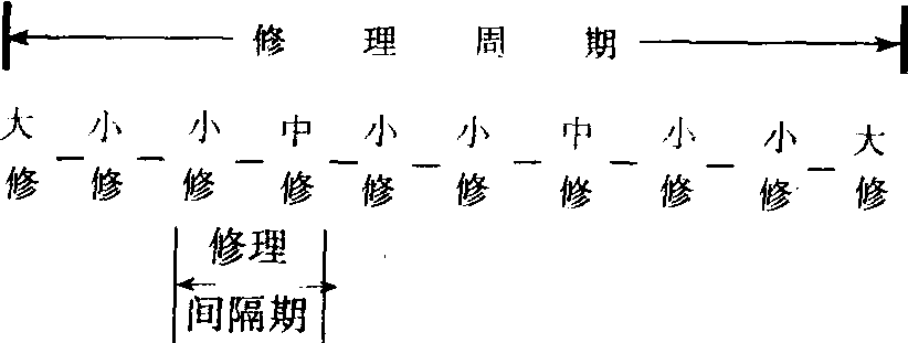 | 释义 | 设备修理周期定额 设备修理周期定额为合理组织设备修理工作而规定的有关设备修理周期、修理间隔期和修理周期结构的标准。修理周期是指相邻两次大修理之间,机器设备的工作时间。对新设备来说,就是开始使用到第一次大修理之间的工作时间。它主要是根据设备主要机构和基准零件的使用期限而定。修理间隔期是指前后相邻两次修理之间机器设备的工作时间间隔。修理周期结构是指在一个修理周期内,大修、中修、小修、定期检查的次数和排列顺序,它可以用结构图表示 (见下图),也可用整数类比关系表示,如图示的修理周期结构可表示为1:2:6。不同类型和不同工作条件下的设备,修理周期、修理间隔期和修理周期结构是不相同的。决定它的因素有: 机器设备的性能、结构、制造时所用工艺和材料,机器设备的利用程度和外界条件,生产中所用原料、材料及生产产品的特点和质量要求,加工对象的性质,操作工人的技术水平和设备维修水平等。设备修理周期定额是确定设备修理类别、内容和修理日期的主要依据之一。