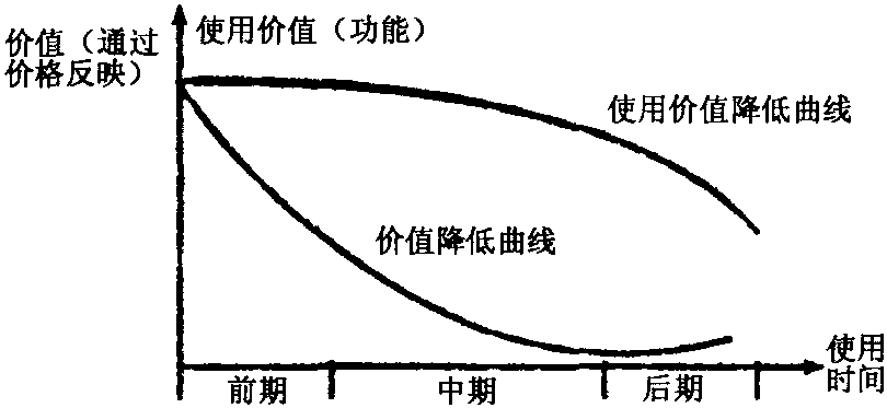 随着设备磨损,设备的使用价值(功能)和价值均会降低,其总趋势是一致的,但在设备寿命的各阶段,其下降的速度是有区别的,如图8-22所示。
