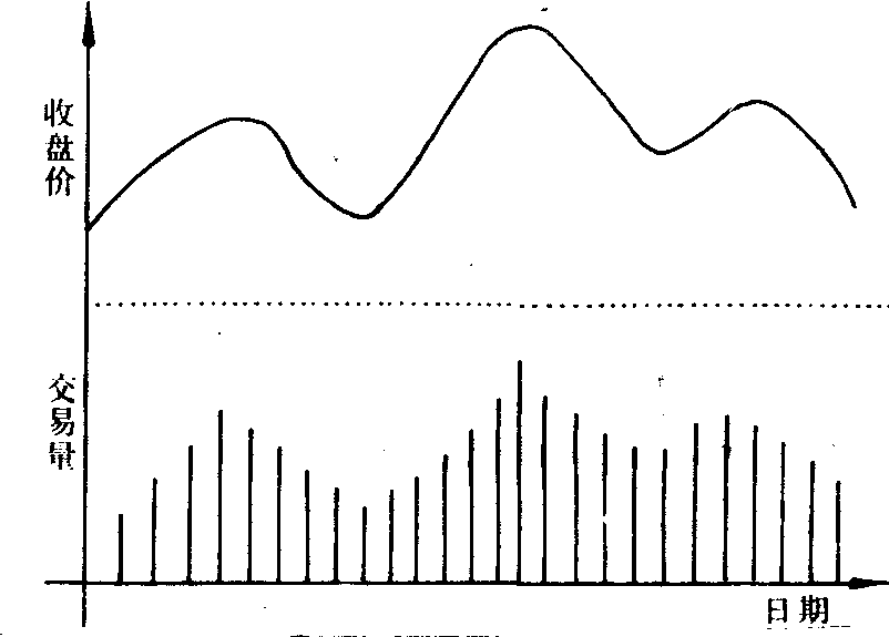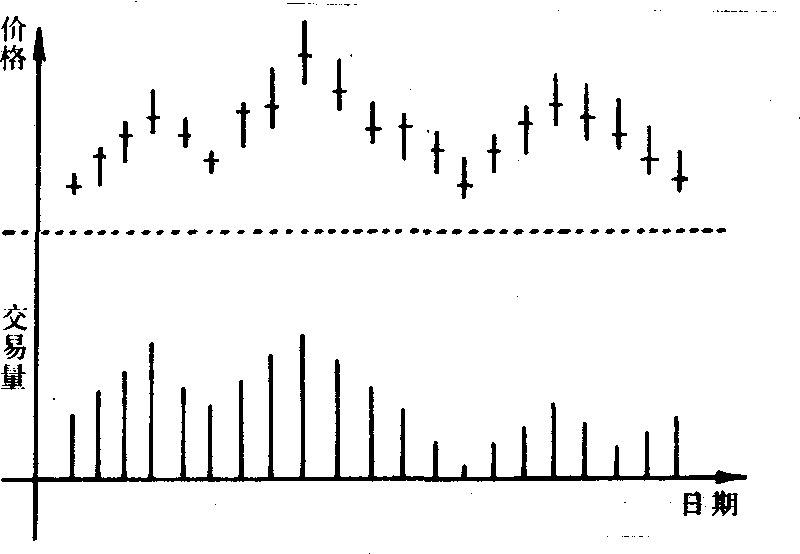 图4-1 棒形图 是证券行情分析应用最广泛的图表。它以一根根竖棒体来表示证券价格的变动(参见图4—2)。竖棒的顶部是某日成交的最高价,底部表示最低价,棒体上的横线表示收盘价。如棒体越长就表明当日成交证券的价格起落越大,反之,则表明价格差别小。棒形图也分为上下两部份,上面部份是以棒形表示的价格变动情况,下面部份是对应的交易量。其主要特点是以棒体的分布反映股价走势,它不仅能反映线形图反映的全部内容,而且还能反映每日证券成交额的价格差。棒形图的图形有头肩形、三角形、旗形、长方形等多种。其分析方法基本上与线形图相同。
