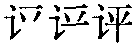 【提示】讠,2画; 第二笔一笔连写,不要错分成两笔。平,第二笔是点,第三笔是撇; 旧字形第二笔是撇,第三笔是点。 *评(評)píng7画 言部 (1) 议论是非得失高下等: ~论|~判|批~|~~这个理儿。 (2) 评论的文章或言语: 书~|社~|一则影~|得到好~。 评評píng古代本作平。平有平论,平议,平定义。中古加言字旁,会意兼形声。是议论或评判义。如:评语|评理|评比|时评。组词如:评论|评议|评价|批评|评介|评判|评阅。 评評★繁◎常★常pínɡ評,形声,从言,平声,本义为评论,判定是非、优劣等,引申为评论的意见、文章等。《简化字表》类推简作“评”。 【辨析】 评/坪/平 “平”指平正、公平,“评”指用言语议论事物是否平正、公平,“坪”指土地平坦,这三个字意义相近,读音相同,是同源字。 |