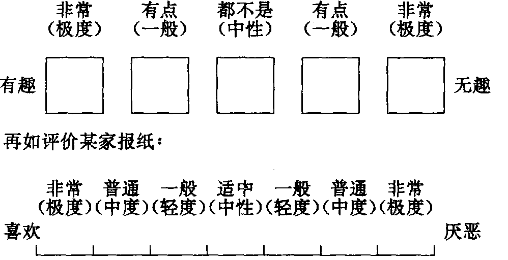 (一)解释的语义差别等级。(二)又称“态度测量法”、“里克特尺度”。由美国社会心理学家J·莫里诺提出,是现代调查问卷中普遍采用的提问格式之一,以语义级差的形式进行指标设计。首先在问卷中确定评价对象,它可以是一家传播媒介、一部作品、一种产品,也可以是设计者陈述的一个观点(一句话)。然后要求人们在两个反义词中做不同程度的选择。这里的语义级差可分为五级或七级。例如评价某支乐曲,可设计如下问题: