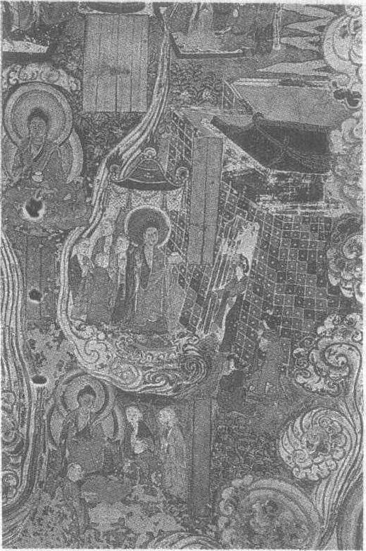 盛唐。纵130厘米,横70厘米。甘肃省敦煌县莫高窟第217窟西壁龛顶壁画。此图所表现的是释迦成道后回迦毗罗卫城探望庶母波阇波提的情景。因思念出家的儿子哭瞎双眼的波阇波提,听说儿子成道归来探亲,喜出望外冲出去迎接。画面上,释迦率众弟子已临近城廓,其母伸出双臂激动相迎。已成道的释迦这时显得沉稳安详,毫无失态。城墙下两妇女合十行礼,态度虔诚。此图的人物感情表达准确,合乎情理,用笔细腻,人物线条的勾勒十分圆滑,赋彩厚重,色泽绚丽。这幅优秀的作品绘于窟顶,绘画者需仰视举臂挥毫,其难度是可想而知的,而所达到的艺术效果又绝不逊色于窟壁所绘的壁画。
