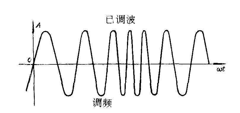 式中A0、ω0和ᵠ0分别为载波的振幅、角频率和初相,即正弦波的三要素。对载波而言,它们是三个常数。使载波的这三个要素之一随欲传输或发送的调制信号的变化而变化,就是调制。已经调制信号调制的高频电振荡或电磁波称为已调波。在调制过程中,使载波的振幅随调制信号而改变的调制方式叫做调幅或振幅调制。经过调幅后的已调波(即调幅波)的振幅,按照声音、图像和其它欲传送信号的强度而变化,从而反映欲传送信号的变化规律。图1示出了载波和调幅波的波形,图中的调制波为一低频正弦波,调幅波的振幅随低频正弦波变化而变化。这反映在它的包络线上。调幅是传送信号用得最广泛的一种调制方式。 在调制过程中,使载波的振荡频率随调制信号而变化的调制方式叫做调频或频率调制。经过调频后的已调波(即调频波),它的瞬时频率偏离载波频率的量与调制信号的瞬时值成比例,而振幅则保持不变,图2为调频波的波形。与调幅系统相比,调频系统有抗干扰性较强和设备利用效率较高等优点。但是调频波占有的频带却远较调幅波为宽,因此调频系统必须工作在超短波波段。 在调制过程中,使载波的位相随调制信号而变化的调制方式叫做调相或位相调制。经过调相后的已调波(即调相波),它的瞬时相角偏离载波相角的量与调制信号的瞬时值成比例,而振幅则保持不变。除了上述的连续波调制外,还有所谓的脉冲波调制。