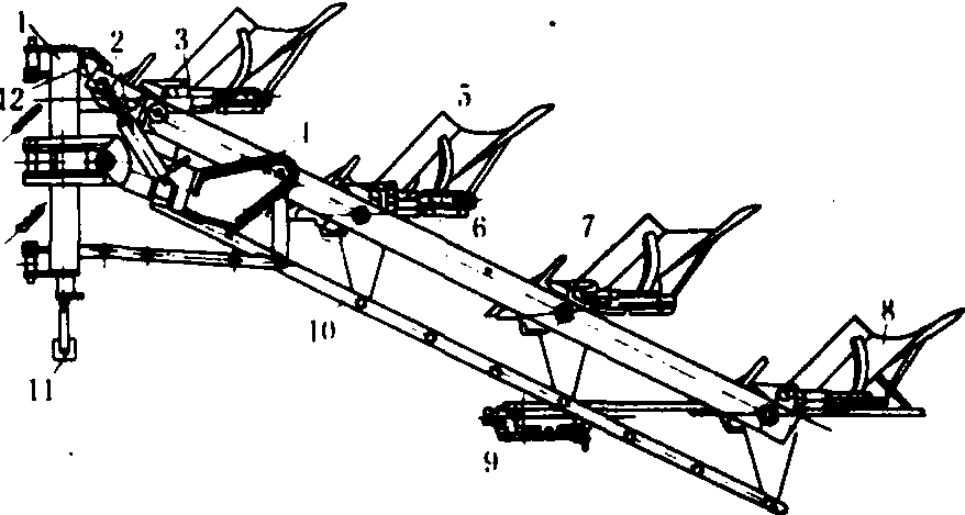 悬挂调幅犁 1.悬挂架; 2.调幅油缸; 3.犁体安全机构; 4.副梁;5.前犁体; 6.主斜梁; 7.小前犁; 8.后犁体; 9.圆犁刀; 10.调幅平行四杆机构; 11.支腿; 12.导向滑槽 调幅犁plow with adjustable width耕作幅宽可在一定范围内作无级调节的铧式犁。调幅犁便于与多种拖拉机配套使用,并可根据土壤比阻随时调整幅宽,提高了犁的使用性能。如ILT-445型与ILBT-445型犁,就是为95.6 kW、117.6 kW轮式拖拉机配套的调幅四铧犁。调幅机构属单油缸滑槽式幅宽控制机构,油缸是主动件,通过导向滑槽控制主梁按特定轨迹运动,并通过两组平行四连杆机构,控制犁体的转动角度和所有犁体动作协调一致,且始终处于正常工作状态。 |