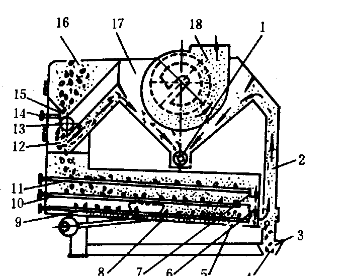 图1 谷物种子加工流程 预处理 见种子加工预处理。 清选分级 其作用目的见种子加工。清选多采用风筛清选机(图2)。喂入料斗的种子进入气流之中,在气流作用下将轻杂物去除,余下的种子经过筛子分选,筛除比作物种子大和小的杂质,包括杂草种子、其他作物种子或损坏的种子。同时又经过后吸风道的气流,将重量轻的未成熟的种子、颖壳等杂质吸到沉降室,而饱满及成熟的种子落下。 经过清选后的种子,再按种子的尺寸长度、宽度、厚度和比重的差异选出合格的种子,并分成等级。