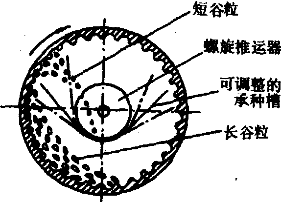 图4 长方孔筛清选谷粒的原理 1、2、3.谷粒厚度小于筛孔宽度(能通过筛孔);4.谷粒厚度大于筛孔宽度(通不过筛孔) 按种子长度分选,可采用窝眼筒和窝眼盘精选机。窝眼筒(图5)由内壁有圆形窝眼的圆筒和承种槽组成。工作时,圆筒作旋转运动,长度小于窝眼口径的谷粒落入窝眼内,随圆筒旋转上升到一定高度,落入承种槽中,随即由螺旋推运器运出机外;长度大于窝眼口径的谷粒,沿筒壁轴向移动,最后由滚筒的另一端排出。承种槽边缘位置可以根据分离效果调整。窝眼筒转速不可过高(一般30~40转/分),以防由于离心力的作用,谷粒不能自窝眼内掉出,影响分离质量。此工序通常安排在筛选之后。窝眼盘精选机是由一组带有窝眼的圆盘,它们按一定间隔安放在水平轴上,窝眼盘旋转时,长度小的谷粒掉入窝眼内,被带到一定高度后排入排料槽中;长度较大的谷粒不能被窝眼提升,通过机器输送到另一端,从而把谷粒分成两级。