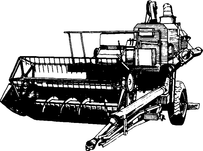 图1 牵引式联合收割机(全喂入型) 自带的发动机传动)。收割前,需由别的机器或人工割出第一圈拖拉机行走的通道。结构比自走式联合收割机简单,价格便宜,使用要求较低,在联合收割机的早期发展中其数量占主要地位。由于受拖拉机动力限制,早期多为小型,割幅一般在2~2.5米左右,喂入量不超过3千克/秒,工效约5~15亩/小时。随着大功率拖拉机(59~110千瓦)的出现,大型高效率的牵引式联合收割机(喂入量达6千克/秒以上)得到了发展。受结构设计的限制,割台多在5米以下。并配有专用捡拾装置,供分段联合收获捡拾脱粒使用。配挂式(悬挂式)联合收割机 配挂在拖拉机或通用自走底盘上。本身没有动力和行走部分,不能单独使用。配挂式又分为全配挂式和半配挂式两种。前者的全部重量都由拖拉机承受,后者本身带有一个支持轮,拖拉机只承受联合收割机的部分重量。这种联合收割机具有自走式联合收割机的灵活方便性,而又不常年占用昂贵的动力和行走驱动装置。机器本身结构比较简单,价格便宜。但这种机器对配挂的拖拉机有一定的安装要求,配套使用不如牵引式机器方便。另外,操作和视野条件一般也较差。配挂在通用自走底盘上的机器,结构设计合理,操作使用性能接近自走式联合收割机。但由于机器设备需成套购置, 投资大,应用尚不广泛。 全喂入型联合收割机 工作时,割下的作物全部喂进脱粒装置进行脱粒,作物茎秆大部被折断或打碎,不能保持完整,但收割作物种类多,适应性广。常见的全喂入型联合收割机有传统式(采用切流滚筒脱粒和逐稿器分离)和轴流式(采用轴流脱粒分离装置),机型大小齐全(割幅2~7米),应用广泛。 半喂入型联合收割机 工作时,割下的作物仅穗部进入脱粒装置脱粒,大部分的茎秆均留在脱粒装置外不受打击,茎秆保持完整。半喂入型联合收割机外形尺寸较小(割幅多小于2米),适用于小田块,以收获水稻为主,可兼收小麦等。这种机型的优点是,收割难脱粳稻的损失少、籽粒破壳少,茎秆能保持完整。 普通型联合收割机 适合在一般平地或坡度很小的地上工作,是常用的机型。在较大的坡地上作业时,整个机身随地形有较大的横向倾斜或纵向倾斜,工作流程变坏,收获损失增大,有时还会引起堵塞。 坡地型联合收割机 适合在坡地上工作的专用联合收割机,一般均为自走式。它的收割脱粒等工作部件基本上和普通型联合收割机相同。特点是它的割台和脱粒机身是铰连在一起的。在横坡地上工作时,割台能沿着地形切割,而脱粒机体则保持水平,不随地面倾斜。由于机身内的工作部件仍保持正常状态,机器作业质量不会变坏,可避免使损失加大。有的坡地型联合收割机的脱粒机身,不仅横向可保持水平,在上下坡时亦能保持水平,以减少损失和堵塞故障。目前的坡地型联合收割机可以工作的最大坡度:横向约20°~25°;纵向不大于10°(上坡)和5°(下坡)。在坡地工作的损失,可比普通型机器的损失少一半。 基本结构及工作原理 谷物联合收割机均由收割台,脱粒机体(包括脱粒、分离、清选、集运储存等工作部件),中间输送装置(过桥),传动系统,以及发动机、行走转向与驱动装置(自走式联合收割机)或牵引行走装置(牵引式联合收割机)等组成。收割脱粒工作主要由割台和脱粒机体两大部分完成。 传统全喂入型联合收割机的作业流程如图2所示。割台由分禾器、拨禾装置(见拨禾扶禾装置)、切割装置、螺旋输送器(见自走式谷物联合收割机)等部分组成,分别用以分开、拨送作物,切割茎秆和集运割下的作物。机器行进收割时,分禾器将要割的作物和割幅以外的作物分开,拨禾装置将其向后拨送至切割器进行切断。割下的作物随即被割台螺旋输送器集送到中间输送装置,然后被送往脱粒机体进行脱粒、分离、清理。脱粒装置由滚筒(纹杆式或钉齿式)与凹板组成。割下的作物沿脱粒滚筒切线方向进入脱粒装置脱粒,脱出籽粒的大部分由凹板筛孔落下进入清选装置。脱粒后的秸草夹带着少量籽粒进入脱粒装置后方的分离装置(如键式逐稿器)进行分离。被分离下来的籽粒和杂质送入清选装置清理,秸草则被排出机外。