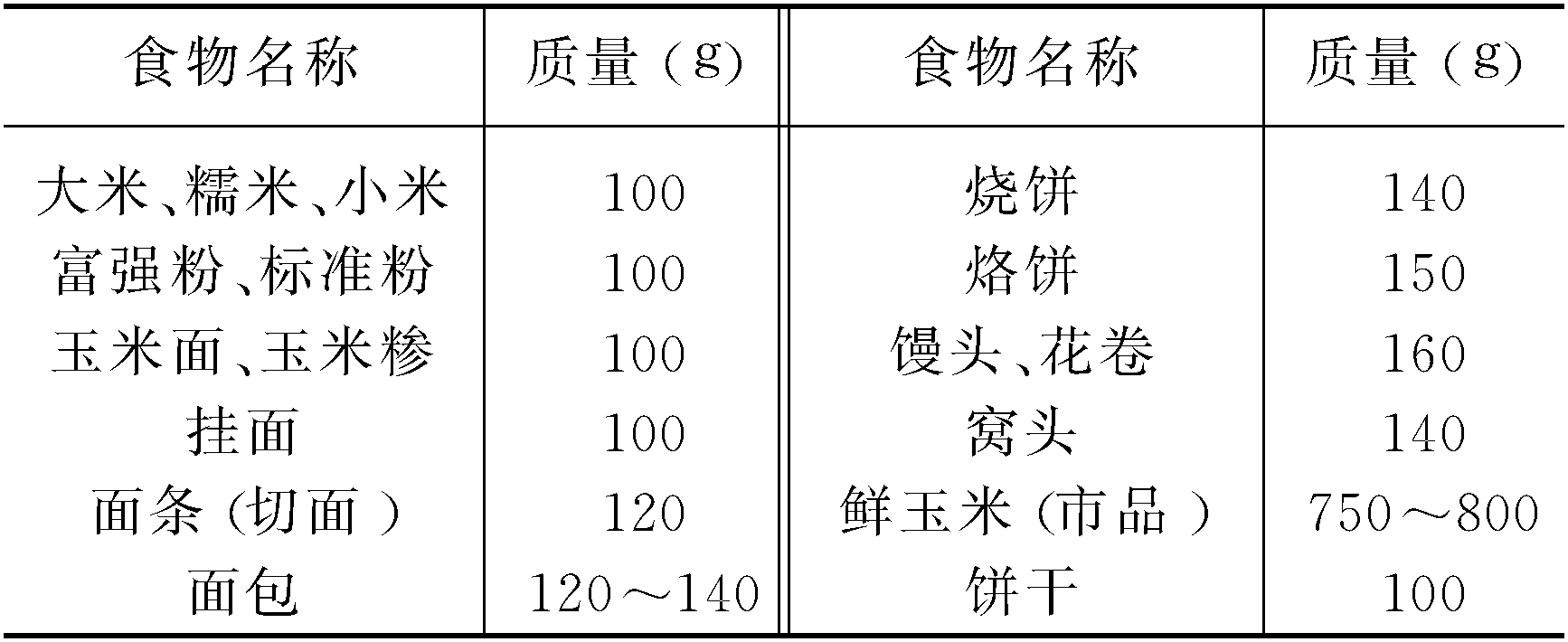 字词 谷类食物互换表(相当于100g米、面的谷类食物)