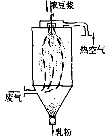 图2 垂直下降顺流干燥塔 喷雾干燥是豆乳粉生产的关键工序,它是在喷雾干燥塔中完成的,一般有压力喷雾及离心喷雾两种。生产中常用的垂直下降顺流干燥塔(图2)在干燥过程中,含水量较高的豆浆液与温度较高而湿含量较低的热空气相混合,完成干燥的过程。为了提高豆乳粉的速溶性,采用离心喷雾比较理想,所生产的豆乳粉应无豆腥味,无杂质,无凝块,呈干燥细粉状。溶解分散性好,不分层,不沉淀。 |