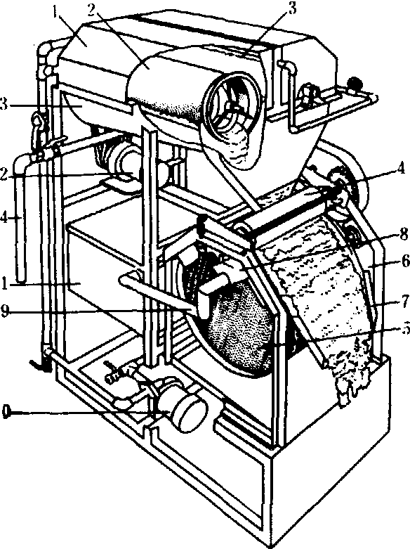 图2 砂轮磨浆机 1.料斗;2.调节手轮;3.上固定盘;4.上砂轮磨片;5.下砂轮磨片;6.下固定盘;7.出料口;8.电机 浸泡 使大豆组织膨胀松软,易于磨制和抽提蛋白质。影响浸泡的因素有原料的品质,浸泡温度及时间等。浸泡时的加水量应以水浸没全部大豆为准。浸泡好的大豆增重1.8~2.5倍,豆瓣的内表面略有凹坑,手指捏之易断,断面无硬心。 磨浆 将浸泡好的大豆磨碎, 使大豆中的蛋白质溶解出来, 形成较稠的豆糊。豆糊的粗细直接影响出品率。磨浆的设备有石磨, 钢磨以及砂轮磨。砂轮磨(图2)由上、下砂轮磨片构成, 砂轮磨片用黑色碳化硅及陶瓷粘结剂烧结而成, 体积小, 效率高, 磨浆时产生热量小。磨浆时的加水量为原料大豆的6~7倍。 分离 又称滤浆,是从豆糊中提取豆浆,除去豆渣的过程。分离的好坏,直接影响豆浆及豆腐的质量。为了尽量回收渣中残留的蛋白质,需要对头遍渣进行清水或淡浆洗涤后再二次分离,二遍渣用水洗涤后再三次分离。分离的方法很多,有人工晃包,振动筛,挤浆机以及离心机等。一般使用浆渣自动分离的砂轮磨连续完成磨浆、分离工作。组合式滤浆机(图3)是一种较好的分离设备,沫糊先经滤浆圆筛滤出头浆,再由加压橡胶辊及大滤浆筒挤出含微细豆渣多而浓度低的豆浆,大滤浆筒表面的豆渣被刮入豆渣接收槽,豆浆由接浆槽经输浆管泵送到滤浆圆筛再过滤,以降低豆渣中的蛋白质残留量。