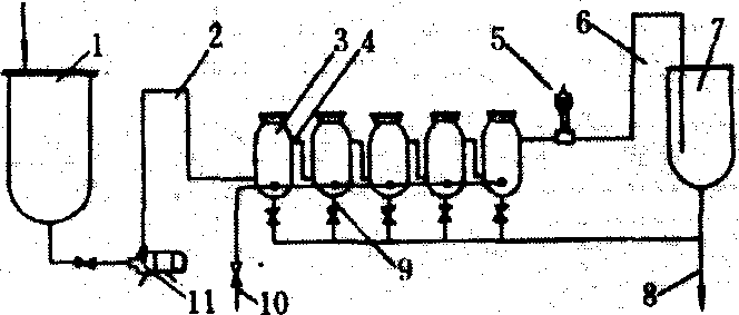 图3 组合式滤浆机简图 1.滤浆圆筛罩; 2.滤浆圆筛; 3.洗涤用蒸汽喷管; 4.加压橡胶辊; 5.大滤浆筒; 6.刮板; 7.豆渣接收槽;8.接浆槽;9.输浆管; 10.泵; 11.沫糊罐; 12.电动机; 13.豆浆罐; 14.豆浆取出管 煮浆 将豆浆加热煮沸,使蛋白质受热适度变性,并使大豆中的酶失活,杀死细菌,消除豆腥味的过程。煮浆对豆腐成品质量的影响至关重要。煮浆的温度应控制在95℃以上,时间为3~5分钟。在煮浆过程中,常加入消泡剂(如油脚,硅树脂等)以除去泡沫。较大型的豆腐加工厂多采用高压蒸汽直接煮浆。常用溢流煮浆罐工艺流程(图4)煮浆,它由5个封闭煮浆罐、蒸汽管、阀门、溢流管及保温套等组成,5个封闭的不锈钢罐用溢流管连在一起,进浆口在罐的下方,出浆口在上方,每个罐都有蒸汽管,根据热浆上升原理,煮浆时先泵送豆浆入第一个罐加温,当浆罐满后,从上口溢到第二个罐加温,逐级溢流,逐步升温,平均每个罐升温10℃以上,豆浆进口40℃,出口90℃以上,达到煮浆目的。