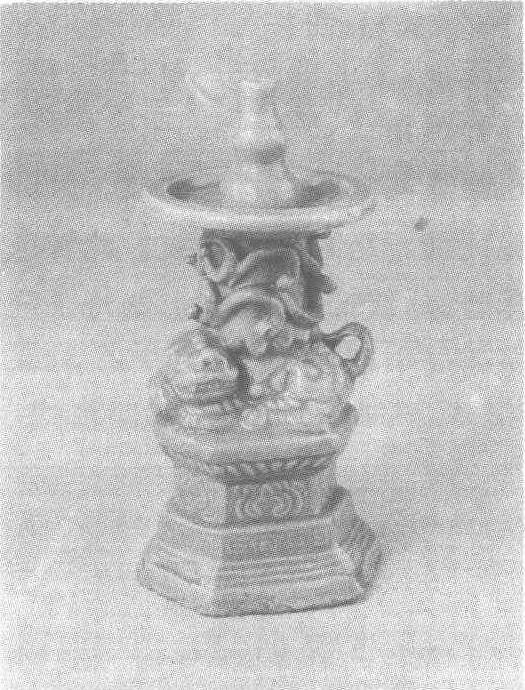 明正统九年。通高23厘米,底径11.5厘米。1966年江西省永修县明吏部尚书魏源墓出土。江西省博物馆藏。此器胎坚质细,通体施豆青色釉,莹润如玉。全器由插烛管、台柱和台座三部分组成。插烛管为一托盘所承的葫芦形。盘内刻暗花缠枝花草,堆塑缠枝蔓草。柱座雕塑一狮,狮子趴伏在一六边形器座上,神态威严。器座呈多级状,并刻有云纹和回纹。此件器物做工精良,造型独特,是正统时期的瓷器珍品。