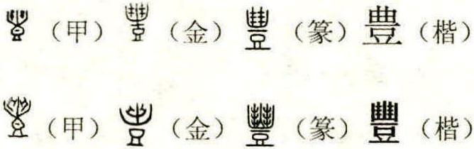 “豊”與“豐”,都是由“壴”組構起來的造字,故在釋“豊”、“豐”以前先得把“壴”再做幾句重復❶。 “壴”甲骨文作“ ”,金文作“ ”,小篆作“ ”,本是“屮”與“豆”的結合體。“屮”是女陰,“豆”是男陽❷,“壴”的表意應該是充漲起來的男根,故給“壴”賦音為“柱”。 “柱”一具豎起之意,二還是炎帝之孫,南方炎帝之祖名。炎帝之孫名柱兒,至今秦晉人給女兒找對象,仍稱“尋柱兒”,這是因為炎帝時代,在關中西部渭河兩岸,曾經發生過柱兒和姬羅一段愛情故事。 “壴”的出現及其賦音,是遠古時代祖先崇拜的產物,就像把“ ”(且)供奉起來頂禮膜拜。於是,許慎就釋:“陳樂立而上見也”,朱駿聲《通訓定聲》也釋:“為人所崇仰者皆曰壴,古以主為之”。“壴”是豊、豐的骨骼。理解了“人所崇仰”的“壴”,對於理解“豊”與“豐”這兩個維妙的造字就容易得多了。 為了方便起間,我們先釋“豐”。 甲骨文的“豐”( ,第一期字形),是給“壴”上放置兩個“ ”(亡)字的組字。“豐”是甚麼? 《儀禮·鄉射禮》中有一段敘述,可以回答這個問題: “司射適堂西,命弟子設豐。弟子奉豐昇,設於西楹之西,乃降。勝者之弟子洗觶,昇酌,南面坐奠於豐上……” 這裏不僅說明豐是放置酒具的盤子,而且敘述了酒文化中“罰酒”的一般過程。既然“豐”是放置酒具的盤子,為甚麼上鑲嵌兩個“亡”字呢?“亡”在甲骨文時代是有無之“無”的意思,《古經解鉤沉》有這樣一段交代:“豐,國名,其君坐酒亡國,戴杆以為戒”,這就把問題說清楚了。喔,原來豐國之君坐酒失國,鑲嵌二“亡”是為了警戒人君,還帶有某些懲罰的意味。 豐,殷墟卜辭用作: (1)人名,“壬子婦豐示二屯。” (2)地名,“王在豐貞。” 金文的豐( ),與甲骨文“ ”無別。小篆作“ ”,作者大概以附會為“亡”麥芒,故訛變成了兩個麥穗的形狀。楷書的“豐”又將麥穗形狀改為兩個“丰”;“壴”的原形被斷成兩截。 “豐”的本意是古代放置酒具的托盤,《儀禮·公食大夫禮》:“飲酒實于觶,加于豐”,說的就是它的本意。從本意引伸有: (1)富饒,《詩經·周頌·豐年》:“豐年多黍多稌,亦有高廩,萬億及秭。” (2)茂盛,《詩經·小雅·湛露》:“湛湛露斯,在彼豐草。” (3)充實,《戰國策·秦》一:“毛羽不豐滿者不可以高飛。” (4)盛大,《易經·豐》:“豐,大也。” (5)國名,《竹書紀年》下:“(成王)十九年,王巡狩侯甸方岳……遂正百官,黜豐侯。”看來成王所黜之豐侯,並非上述“其君坐酒亡國”之國,可能另有他指。 (6)地名,豐縣,屬今江蘇轄;豐臺,在今北京市。 (7)都邑,《詩經·大雅·文王有聲》:“既伐於崇,作邑於豐。”豐在今西安市灃東區。 “豐”還孳乳了以下漢字: “豐”、酆(邑)、灃(水)本為一字。隨著“豐”的意域擴大,意寓延伸,為了表意上的準確無誤,分別增加“邑”和“水”的形符。這就是漢字在發展過程中不斷繁化的內在規律,並非像有些人所說的“簡化是漢字發展的規律”。 酆,周文王、周武王在“豐”的都邑,故址在今西安市灃東區灃水東西兩岸。 灃,水名,出自西安終南山峪。灃水之西為灃京,文王都邑;灃水之東為鎬京,武王都邑。 豔(艷):從盍(色)。盍有覆蓋之意。“豐”可覆壓世俗的華麗、光彩、美好。晉·張協《七命》詩句:“流綺星連,浮彩豔發。” 《說文》:“豐,豆之豐滿者也。從豆,象形。”釋義說得過去,析形有誤。 在這裏有必要再連綴一個古字“丰”。 “丰”甲骨文作“ ”,金文作“ ”,小篆作“ ”。“丰”(ㄈㄥ)《說文》釋:“草盛丰丰也。從生上下達也。”許慎與其說“草盛丰丰也”,不如說“樹木丰丰也”,因為“丰”是表意樹木的。我國春秋以前的墓葬原則是“不封不樹”,就是說既不封成土堆,也不在土堆上栽植樹木,以樹立標誌,其實這個“封”就是樹立的“樹”,從甲骨文到小篆都是一棵樹木的造字,許慎說“從生上下達也”是對的。 我們現在所謂的“封建”,就是西周初期的“封土建邦”,而“邦”(金文作“ ”)就是周天子樹起之邑,或者說是諸侯拿上“丰”去建立自己的邦邑。再深一點說,諸侯(“夂”腳)一旦踏上這個“丰”,便可“逢”兇化吉,登“峰”造極,和“鋒”芒畢露了。楷書的“丰”,也有字理:它是由四個陽爻穿插組構而成,或者說是“ㄧ”(時間符號)對“☰”(乾)的三通,這都是對人生命力的張揚。 “丰”的本意是樹的形象的樹立,引伸有: (1)體態豐滿,《詩經·鄭風·丰》:“子之丰兮,俟我乎巷兮。” (2)風度神采,清·江藩《漢學師承記朱筠》:“天下士仰慕丰采,望風景附。” (3)姿態美好,《太平廣記·紀聞》:“有貴主,年二十餘,丰姿絕世。” (4)雍容華麗,南朝·謝靈運詩句:“解作竟何感,升長皆丰容。”(《於南山往北山經湖中瞻眺》) (5)豐盛茂密,漢·司馬相如《長門賦》:“羅丰茸之遊樹兮,離樓梧而相撐。” 概而言之,“豐”是植物自然生命的茂盛;“丰”是人的自然生命和精神生命的旺盛,“豐”和“丰”原則上說是有區別的。但是,如今“丰”作“豐”的簡化體也不是不可以的,而“沣”、“艳”都改過來了,就是這個“酆”一改就變成“邦”了,這是“系統”出了問題,牽一髮動全身,怎一個“規範”了得! “豊”自丰、豐中孕育,從人類進化中走來,也是人性升華的反映。 現在釋“豊”。 在釋“豊”之前,先將荀子《禮論篇》中的一