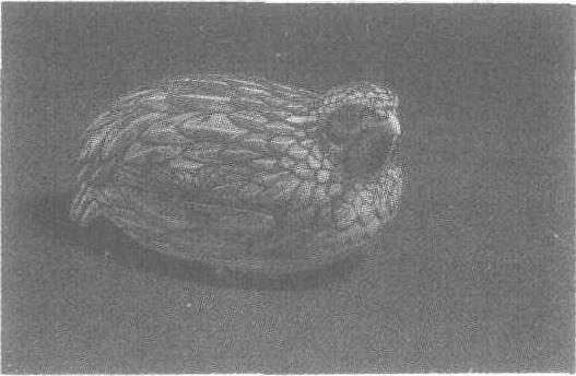 清雍正至乾隆(公元1723—1795年)。高5.5厘米,长10.9厘米。北京故宫博物院藏。盒作一团卧鹌鹑状:其遍体雕饰鳞羽纹,自头顶与胸部呈散射状向外逐渐扩展、增大;尾下垂,头微仰,眼睛睁得圆圆的盯着前方,尖喙紧闭,颈处羽毛扑起,神色紧张,一副大敌临头之状。造型朴实无华,形态自然生动,不加琢饰,体现了清代中前期的一种牙雕风格。