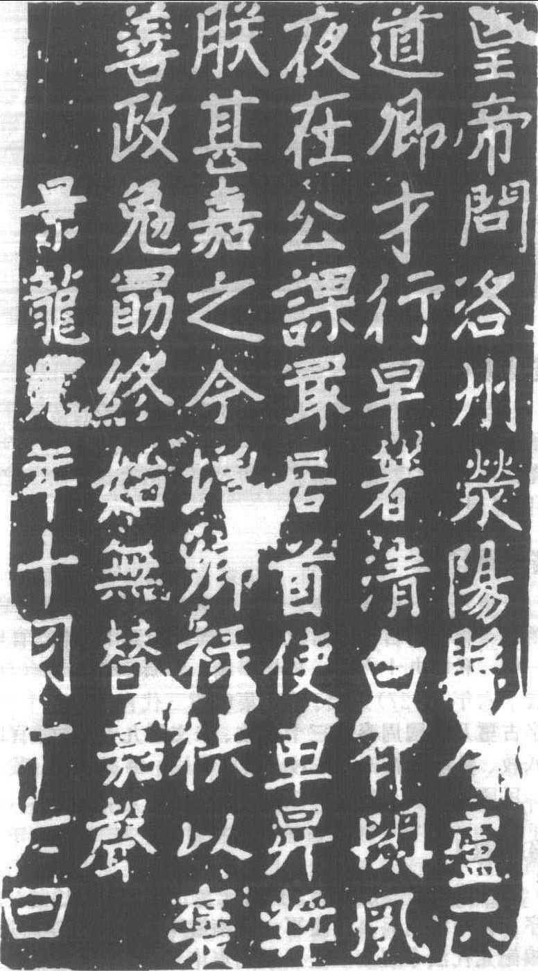 唐·景龍元年 (707) 刻。為中宗皇帝 (李顯) 敕,中宗御書。楷書六行,行十一字,字徑五寸許。唐歷代帝王均善書,各精一體,中宗尤擅楷書。此敕筆法勁拔雄秀,冠冕堂皇,細觀之,頗有奇特之感。其筆勢偏平,似用偏刷所寫,作為帝賜書,略欠自然,但不失為佳作。碑陰刻有〈廬正道清德碑〉。石在河南成皋縣 (今滎陽縣)。