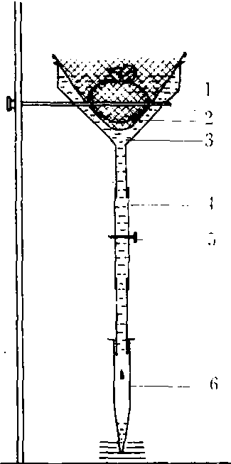 漏斗分离装置 1.样本 2. 铜筛 3. 水 4.橡皮管 5. 弹簧夹 6. 离心管 |
