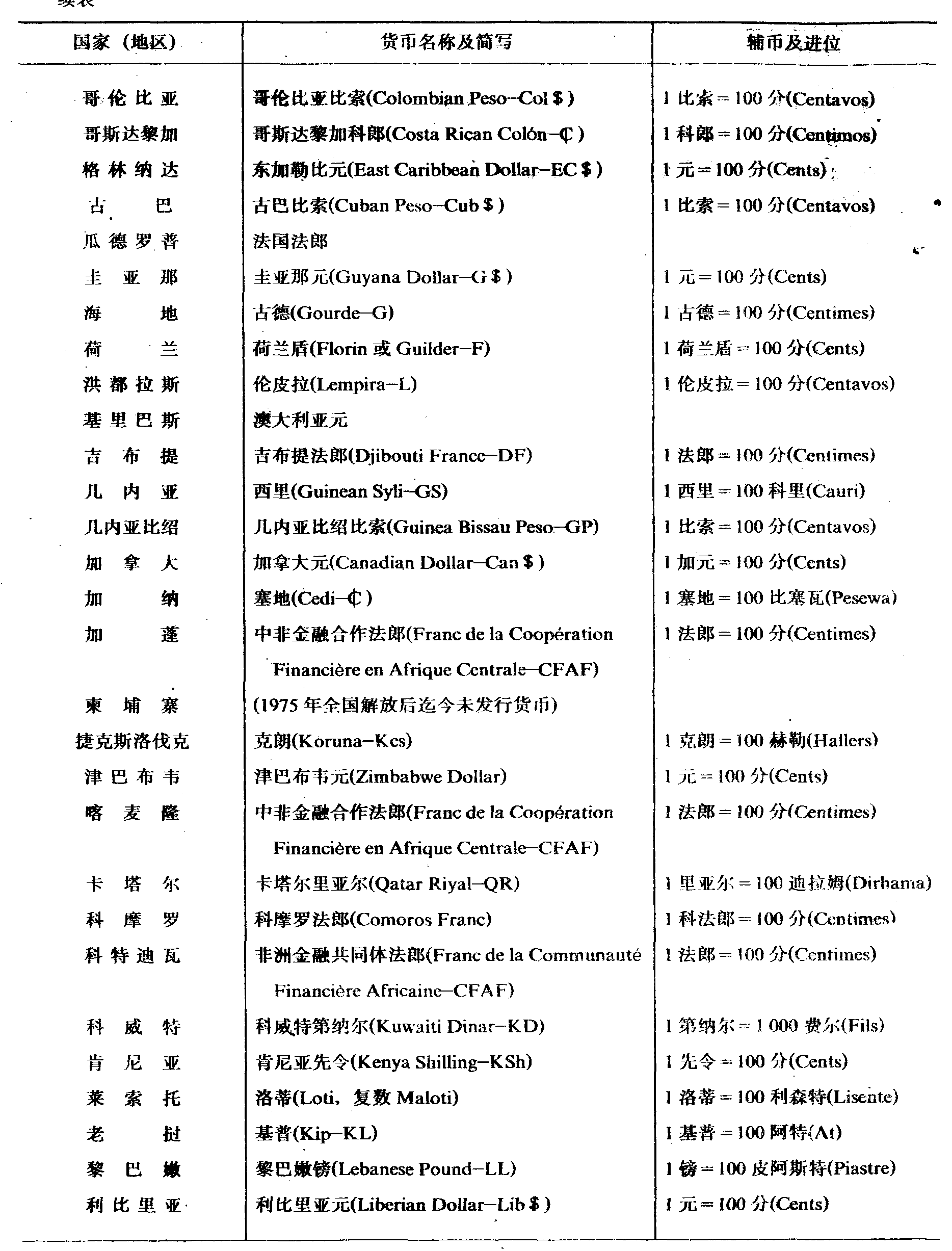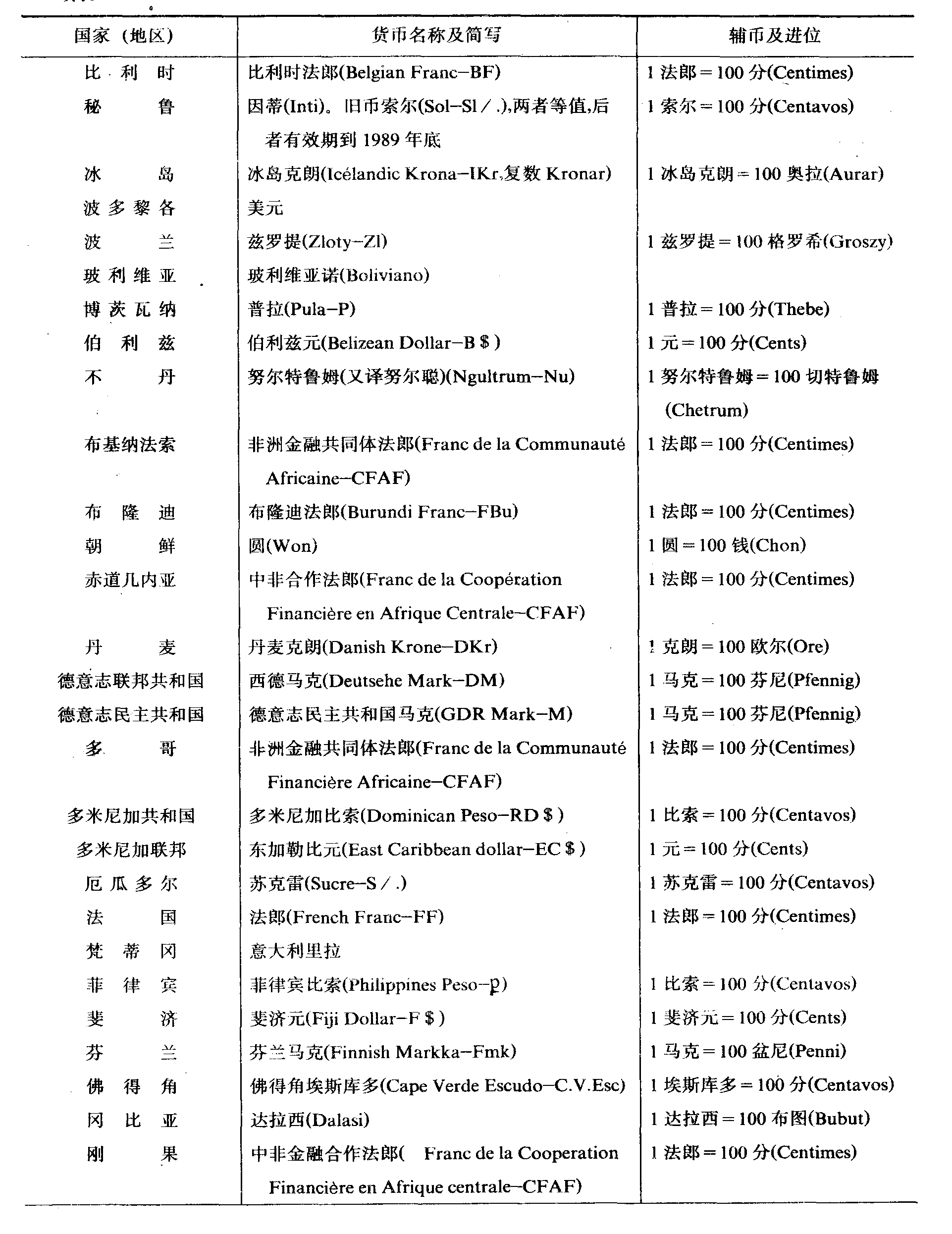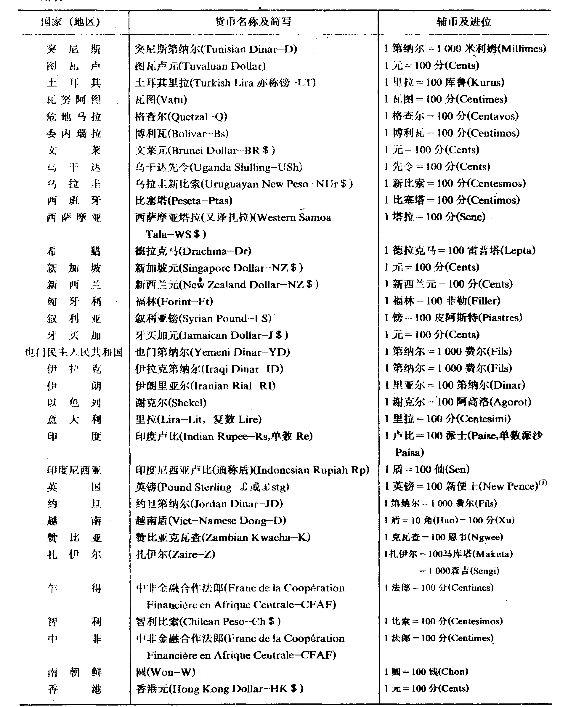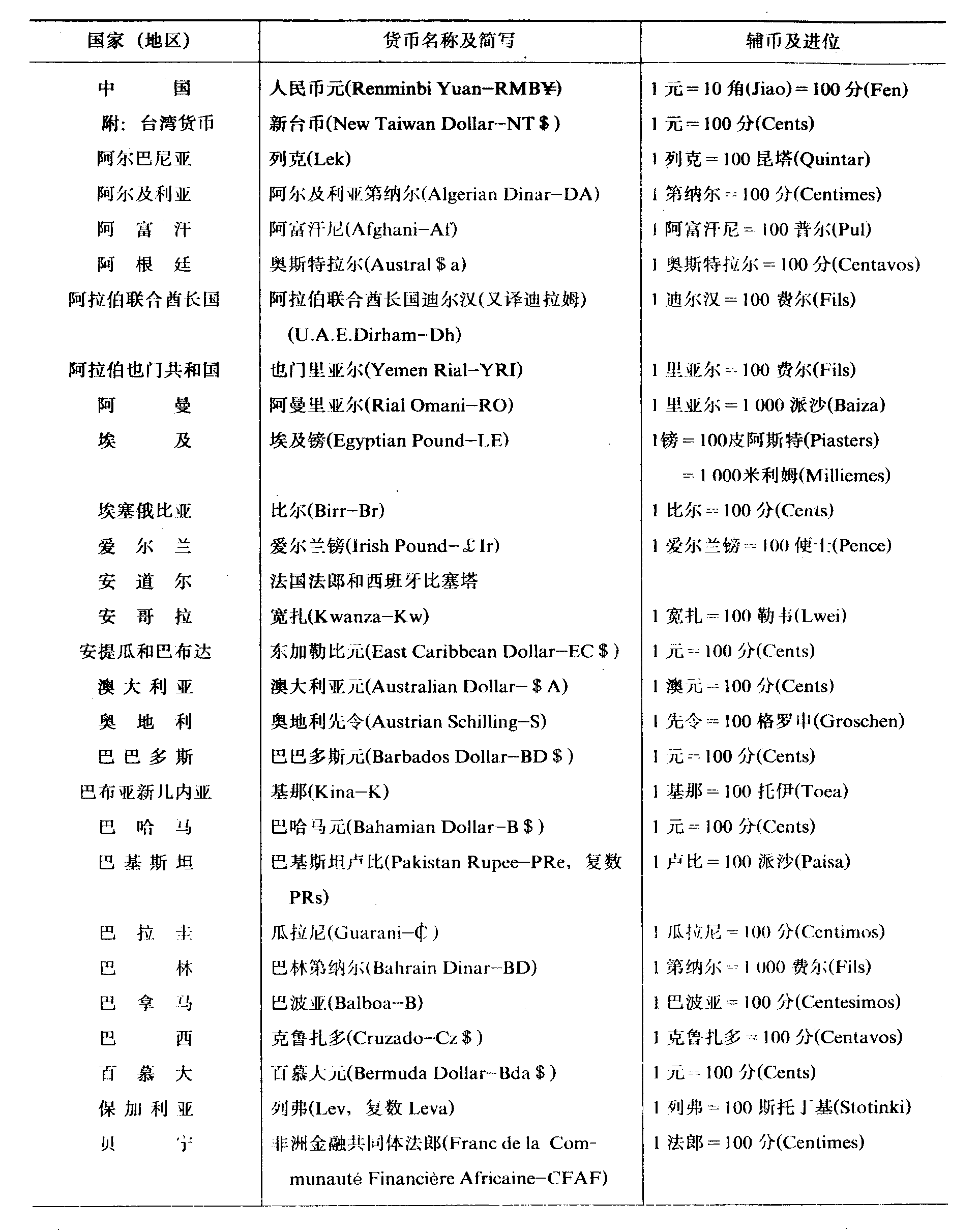 世界各国 (地区) 本位货币名称一览表