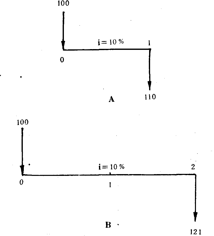 现金流图 货币资金的运动包括不同时刻的资金流出和流入。为了明确地表明不同时刻货币资金的流出和流入情况,可以采用图解法把不同时刻的现金流以简单而清晰的方式表示出来,这就是所谓的“现金流图示法”。这种方法是把货币资金作为时间的函数,用图形表示出来。横轴的右方代表时间的延伸,横轴上的坐标表示每一时间区间的终点,横轴的零点代表现在的时刻,以横轴上引出的带箭头的垂直线段,代表货币资金值。在时间零点的资金值,就是资金的现值,而在时间轴上不同点的垂直线段就是那个时刻的资金值,即终值。垂直线段指向时间轴表示资金流入,而背向时间轴则表示资金流出。例如,从贷款人方面看,为在一年后收回110元而目前贷出100元,其差额10元就是本年的利息,为在两年后收回121元而目前贷出100元,其差额21元就是这两年的利息,用年利率表示都为10%,现金流图示如图2-3: