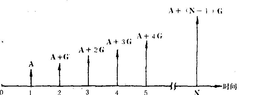 图2-7 ❹递增年值G。这是属于分期但不等额支付或收入的现金流。其特点是从第二年年末开始,其费用每年以一定的金额递增,一直到第N年。也可以从第二年开始,其费用以一定的金额递减,一直到第N年。这种现金流由两个部分组成,一是其年值A,二是差额G。递增年值流图示如图2-8: