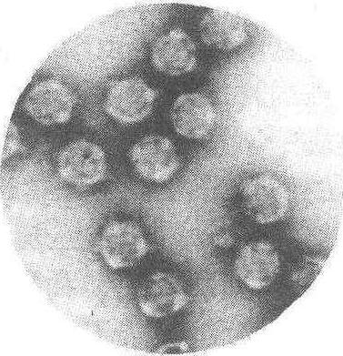 图 1 质型多角体病毒粒子 16~30%,总分子量为14.6×106,其编码为R/2: ∑13/25∶SO/S∶1/0。质型多角体病多角体是1种蛋白质晶体,其内包含着大量病毒,表面附有游离病毒。多角体通常为六角形,长宽为0.5~10微米,也有四角形和三角形(图2)。病毒的稳定性与病毒所处的状态及环境有密切关系,在多角体内的病毒比游离病毒保持活性的时间要长得多; 在干燥状态下,质型多角体病毒于1年后还保持相当的活性,有时4年后还不完全失活,但遇高温容易失活。质型多角体病毒在0℃以下保存时,致病力几乎不变,在普通蚕室条件下,致病力至少可保持3~4年。在25℃2%甲醛的石灰饱和液中浸渍20分钟;在20℃有效氯0.3%的漂白粉溶液中浸渍3分钟;在25℃1%石灰浆接触5分钟以及在比重1.06克/厘米3的盐酸44℃中浸渍3分钟,都能使质型多角体病毒失去传染性。100℃湿热经3分钟和日光直晒经10小时也能使质型多角体病毒失去传染性。